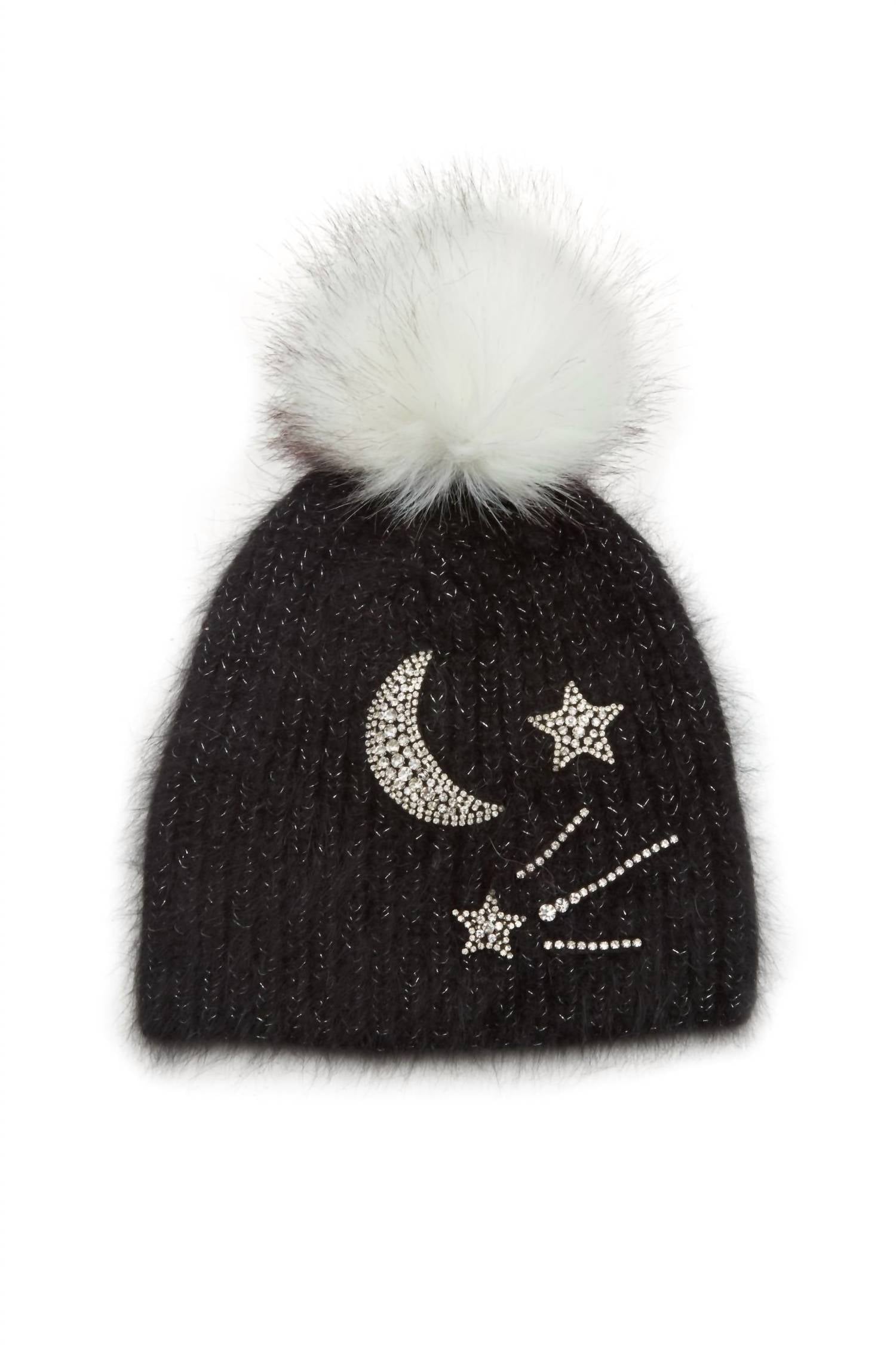 Turn heads in this stylish and chic hat. Not only is this accessory a must for keeping the sun out of your face, it will also be the perfect complement to any cute warm-weather outfit.Moon and Stars Hat. The plush moon and stars hat. Featuring a pom pom accent. Embellished with gemstones. Soft and cozy. Faux fur pom pom. 72% Acrylic, 21% Modacrylic, 7% Polyester. Hand wash. Imported