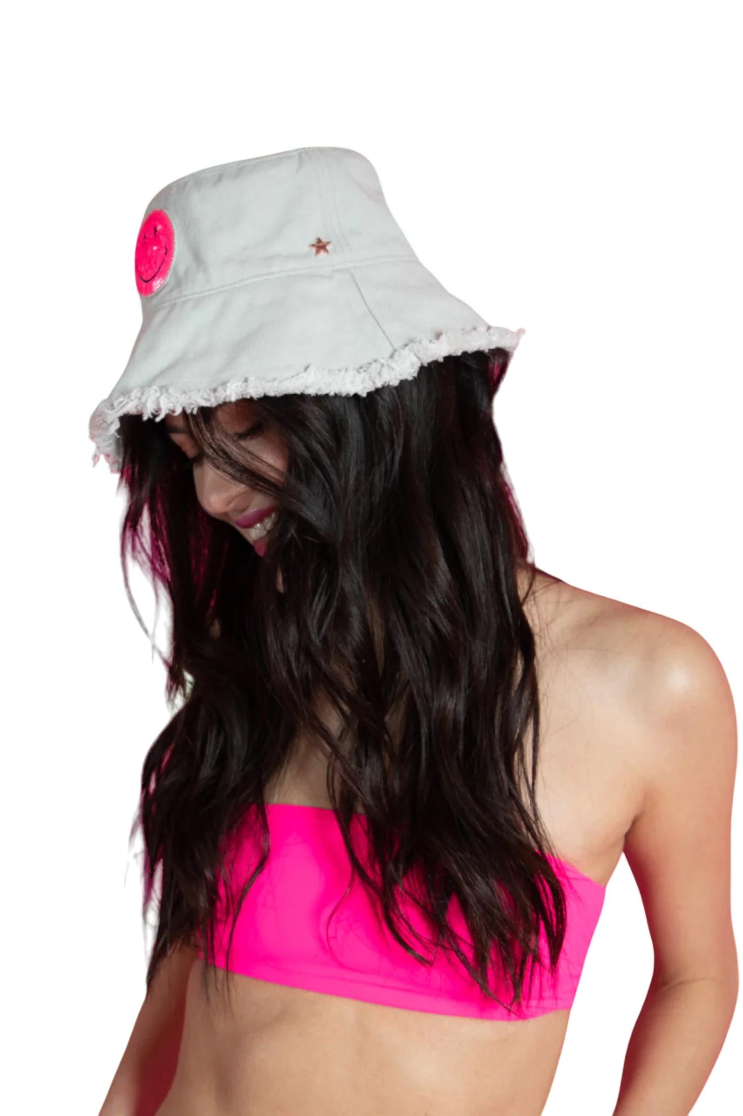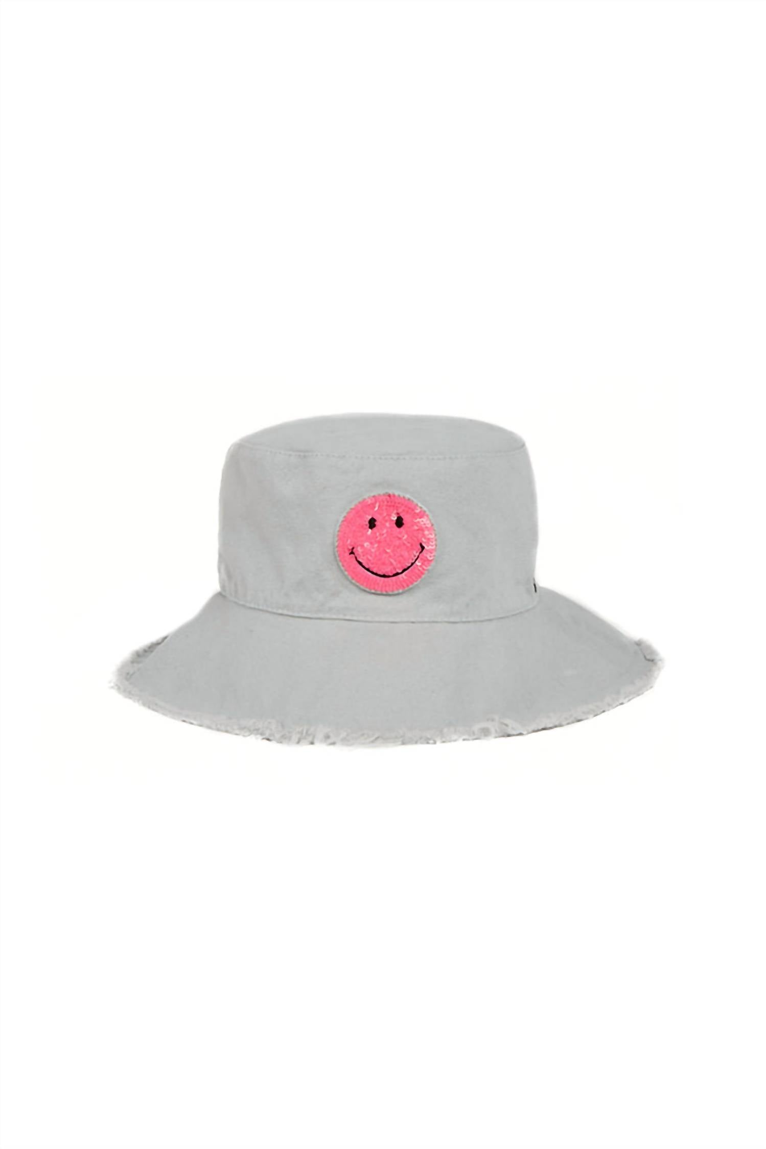 Introducing the Women's Bora Bora Bucket Hat by Jocelyn, a classic accessory designed to bring joy to your wardrobe. This charming bucket hat features a playful smiley face patch, available in a stylish grey with hot pink. Its frayed edges add a touch of casual flair, making it a perfect choice for relaxed, sunny days. Made with care to keep you fashionably shaded.