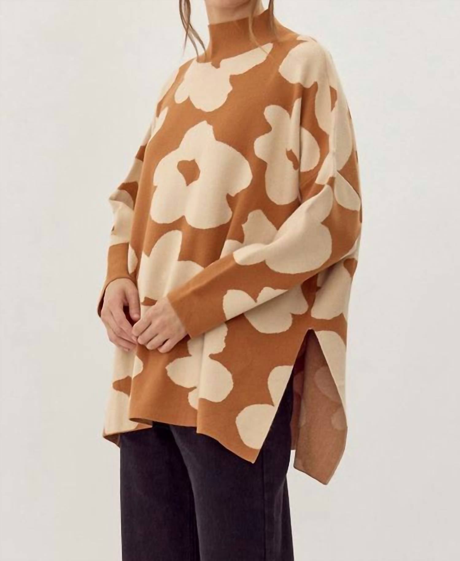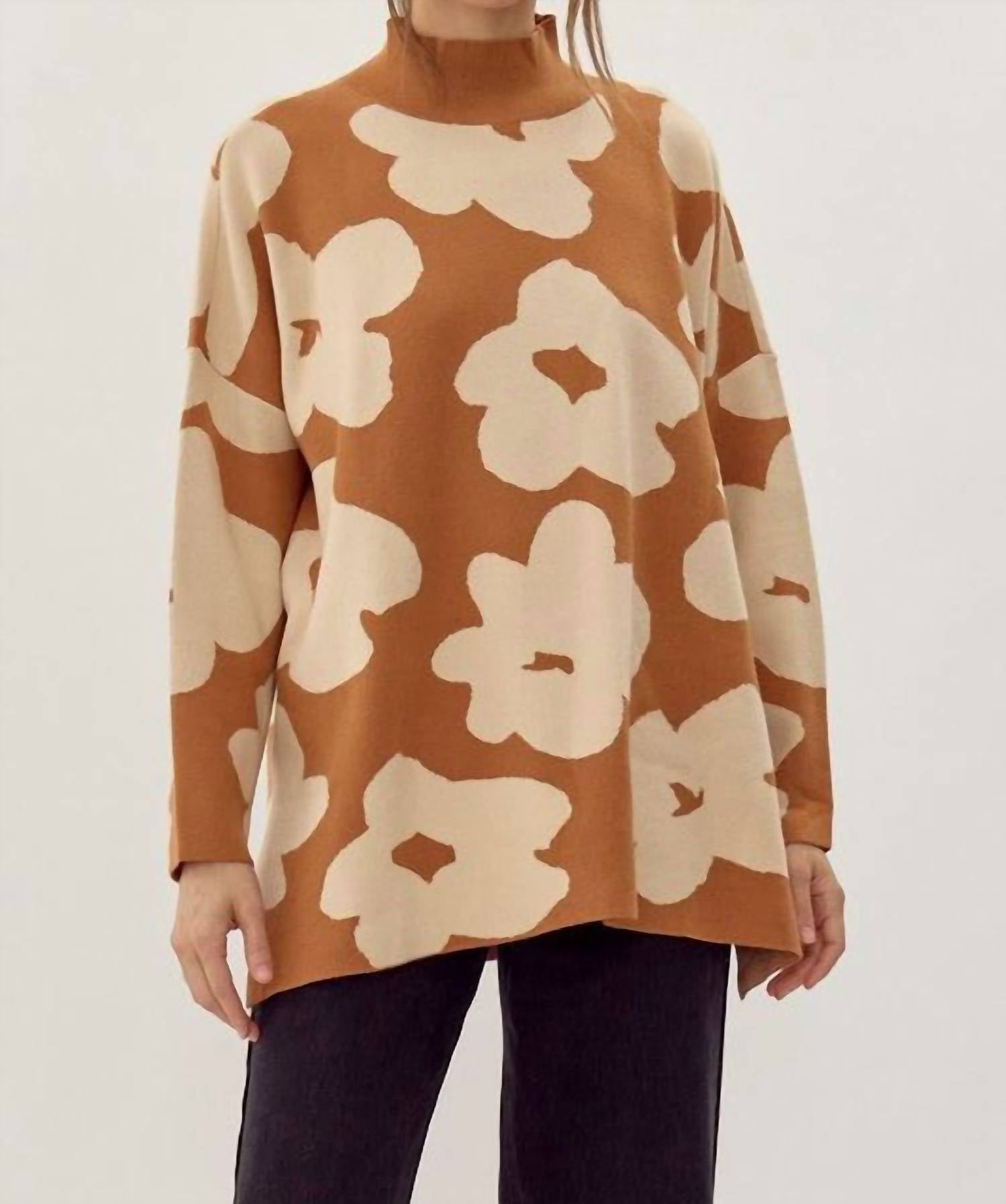 Layer under your favorite sweater or wear tucked into jeans for a perfectly polished winter look. Indulge in comfort and style with the Floral Sweater by Jodifl, designed for the modern woman. This cozy piece features long sleeves and a charming floral pattern in toffee and ivory. Made for game day and beyond, it boasts a chic mockneck and an oversized fit. Closure: Pull on. Wear it with your favorite jeans or leggings to embrace the fall season effortlessly.
