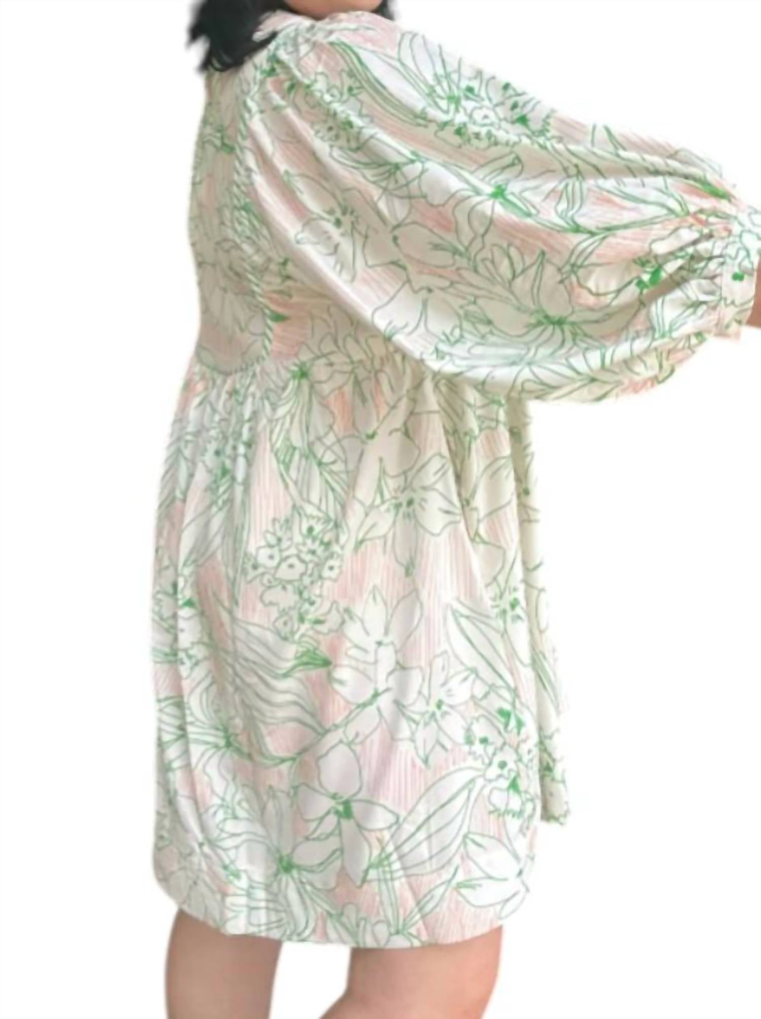 Lily Pad Mini Dress by Jodifl is your go-to choice for a boho chic look. With three-quarter voluminous sleeves and a charming flower print, this mini dress is perfect for vacations. Made from 95% Polyester and 5% Spandex, it offers a non-sheer, lightweight feel. Featuring a tie neck closure and practical side pockets. Model is 5'7'', a size 10/12, and is wearing a large.