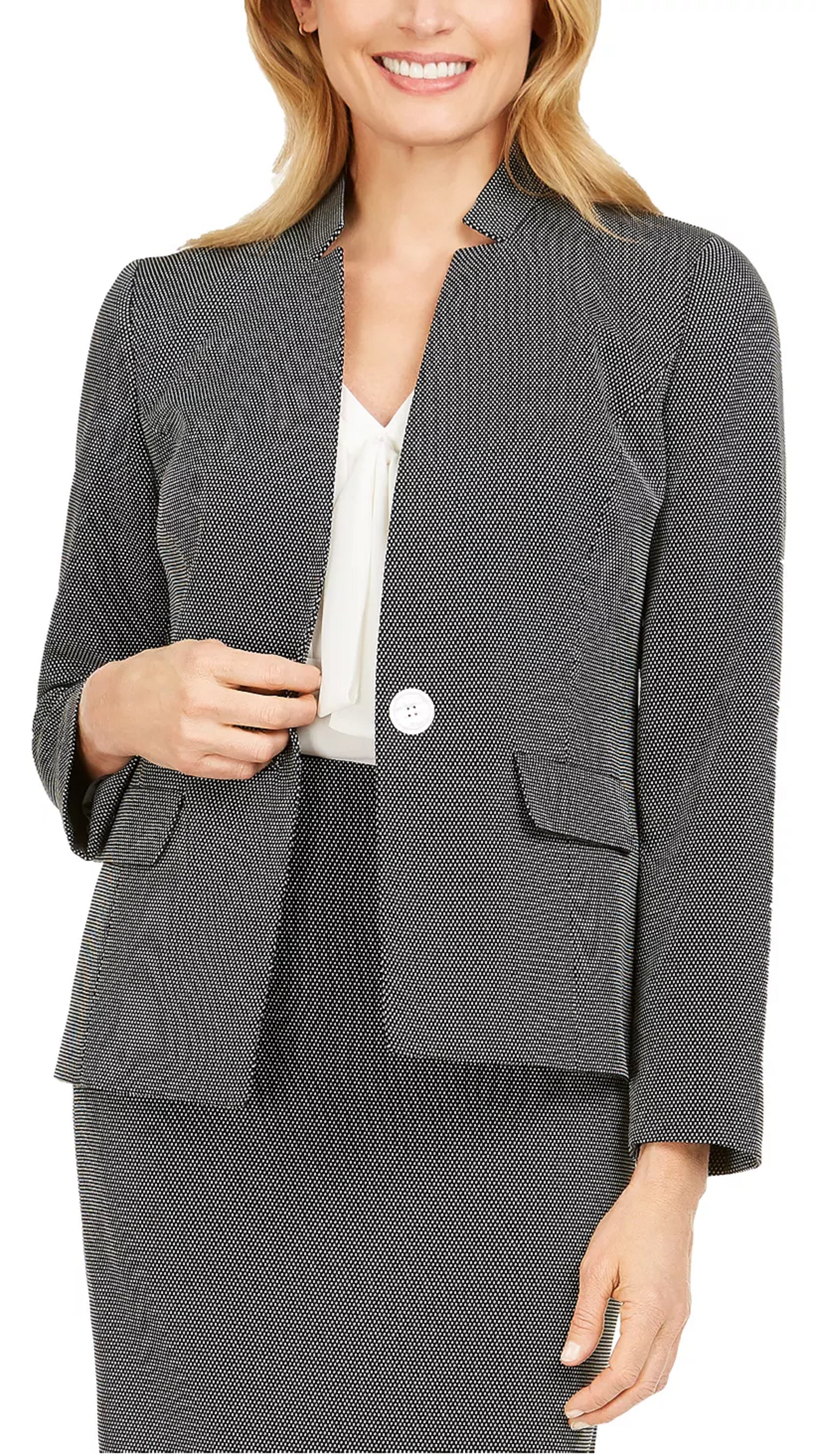 Approx. length; 25|Notch collar; button closure at front|Shoulder pads|Flap pockets at front|Lined