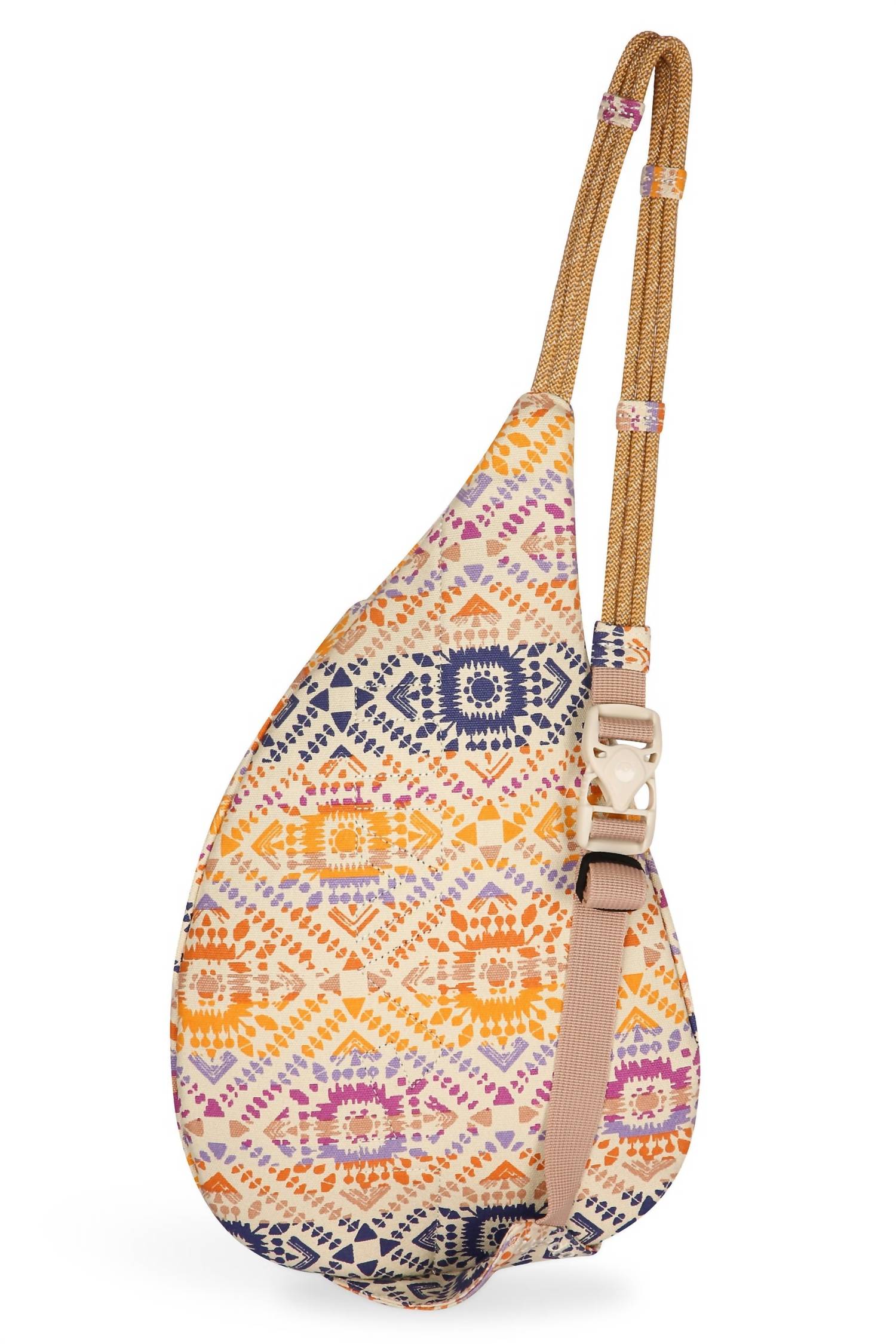 The KAVU Mini Rope Bag in Trail Chic is a compact and stylish sling pack, perfect for on-the-go adventures. Featuring an adjustable rope shoulder strap with a side release buckle, it ensures a comfortable and secure fit. Crafted from durable 12oz 100% cotton canvas with a 100% polyester lining, this bag includes two vertical zip compartments and two pockets for keys or cell phones. It measures 16” x 9” x 4" with a crossbody strap length adjustable from 20" to 40".