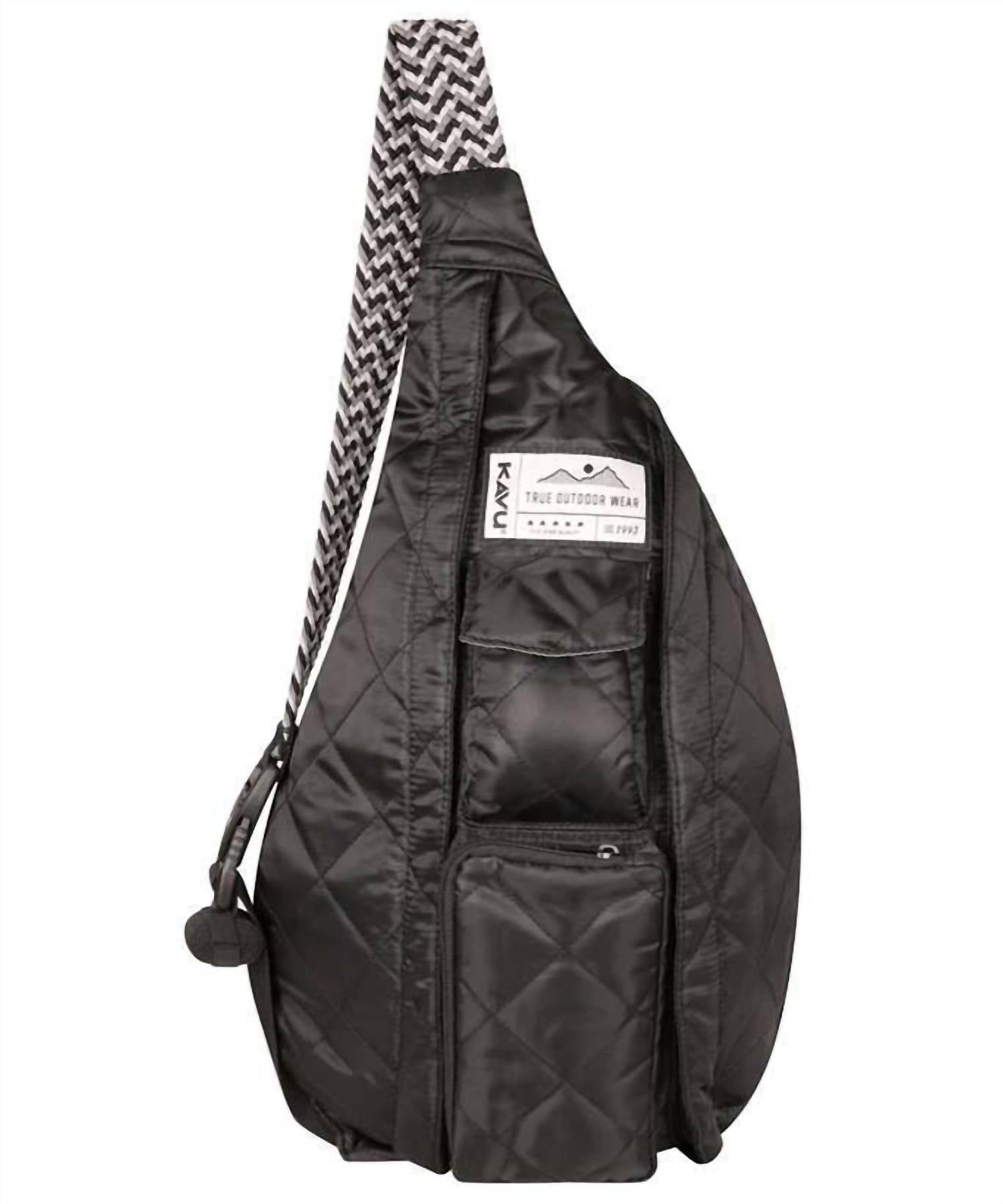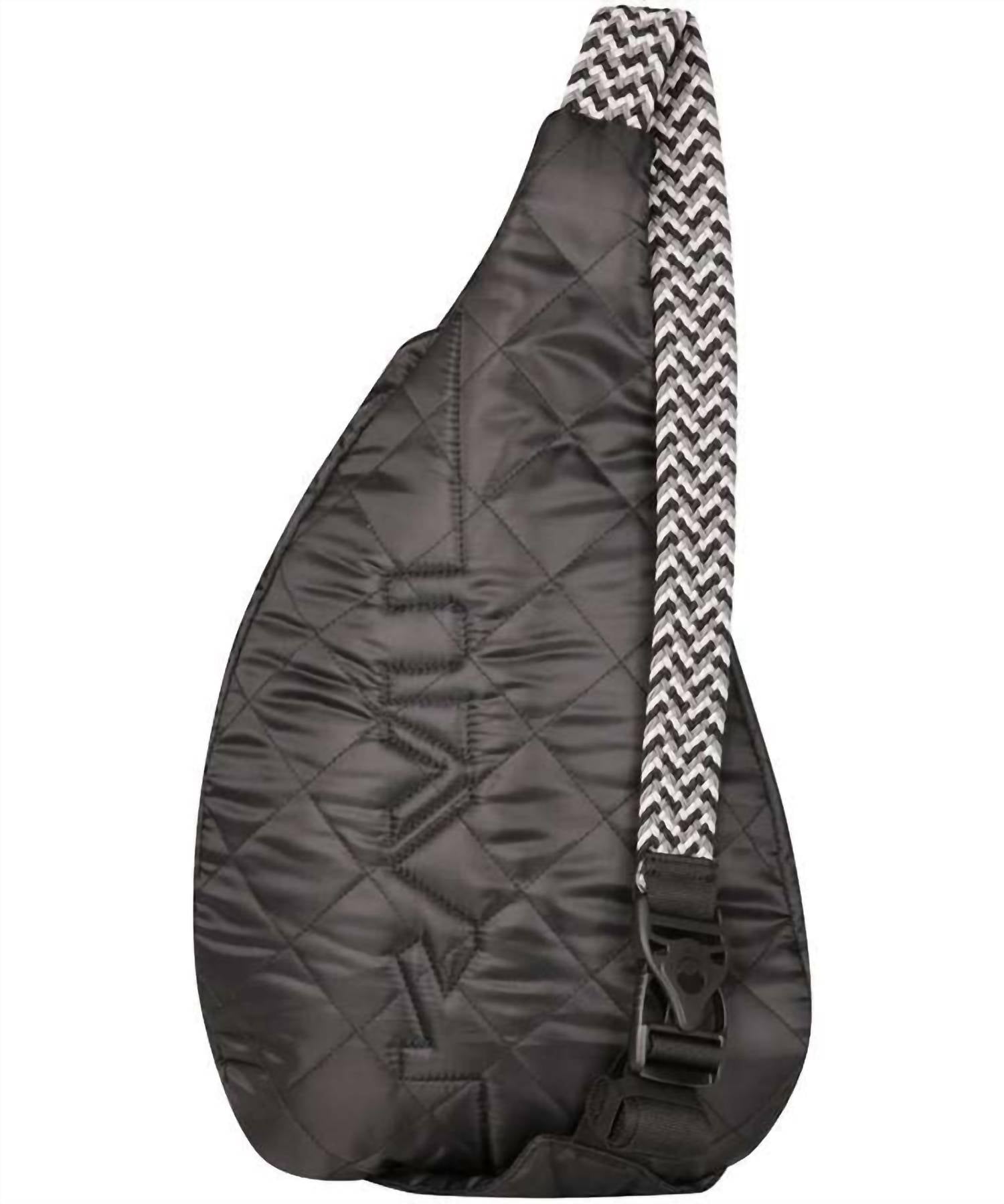 Introducing the Rope Puff Bag by KAVU, a stylish black backpack that combines fun and functionality with its quilted 12oz 100% polyester fabric. Designed for convenience, it features an adjustable braided elastic rope shoulder strap with a side release buckle, ensuring a perfect fit. This versatile bag boasts two vertical zip compartments, two key or cell phone pockets, and a padded back with signature KAVU embroidery. Its dimensions are 20” x 11” x 5", accommodating up to 10L, with cross body strap length ranging from 22" to 44".