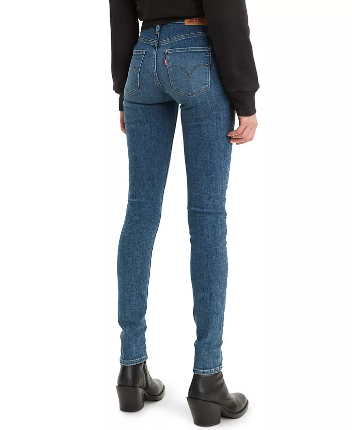Studded details at side seams|Tummy control panel|Zipper and button closure|Belt loops