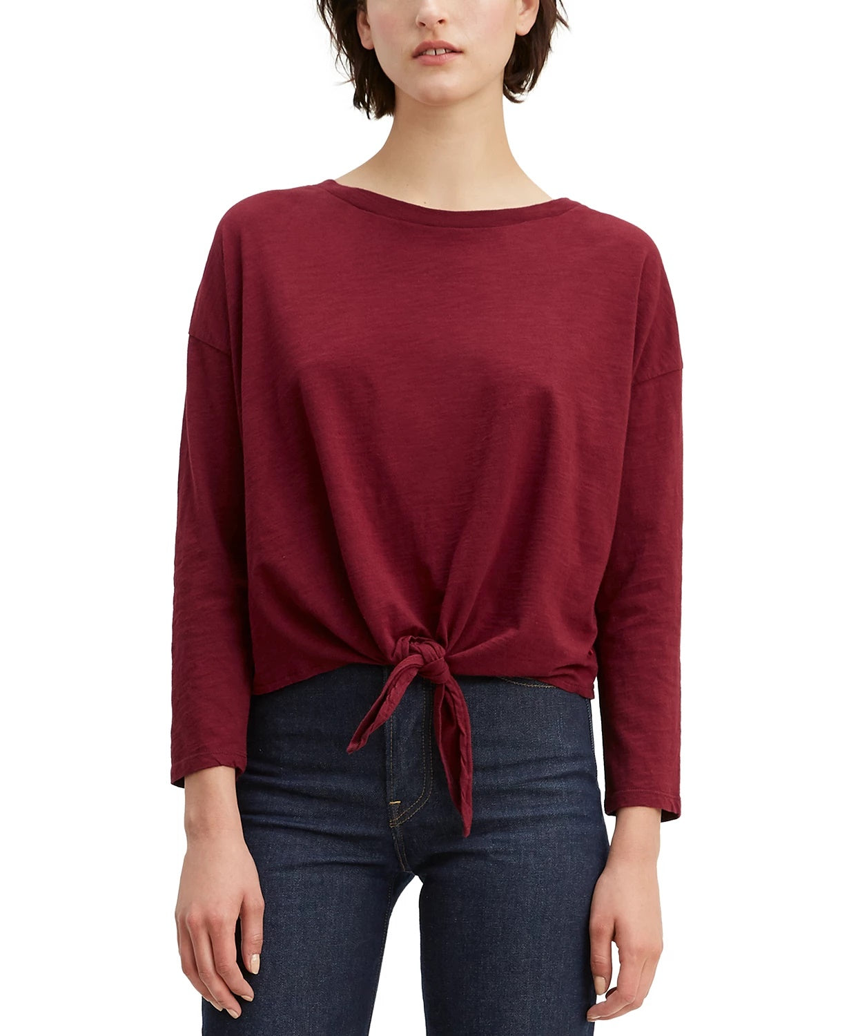 Regular fit|Wide crewneck|Knotted tie at front hemline|Drop-shoulder dolman long sleeves|100% cotton|Machine washable