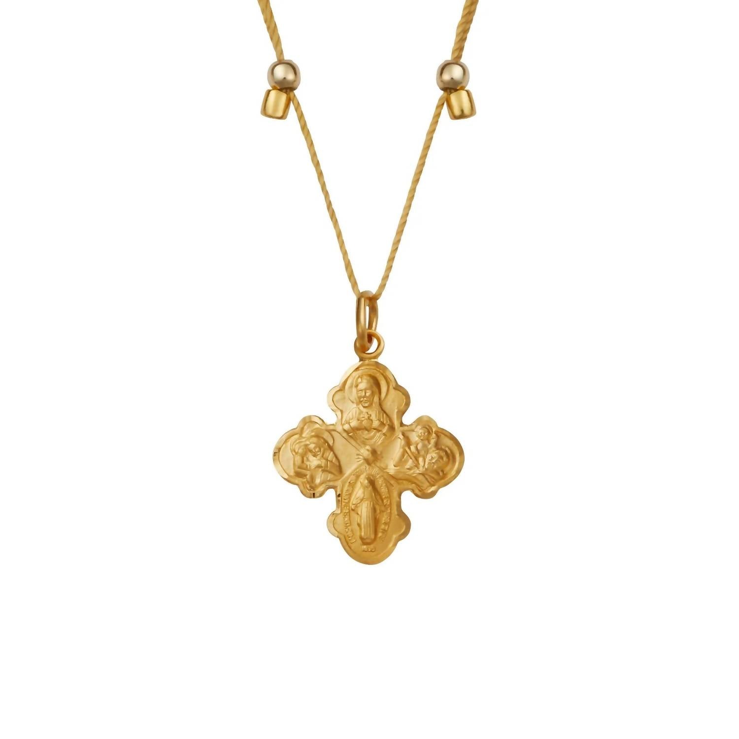 The &LIVY 4-Way Cross Necklace in Gold on Gold is a meaningful accessory crafted from lustrous yellow gold. This necklace not only showcases your faith but also tells a story with each image on the pendant: from Jesus’ heart symbolizing divine love to Mary’s representation of compassion. With St. Joseph and St. Christopher also incorporated, this piece serves as a gentle reminder of support, guidance, and protection in daily life.