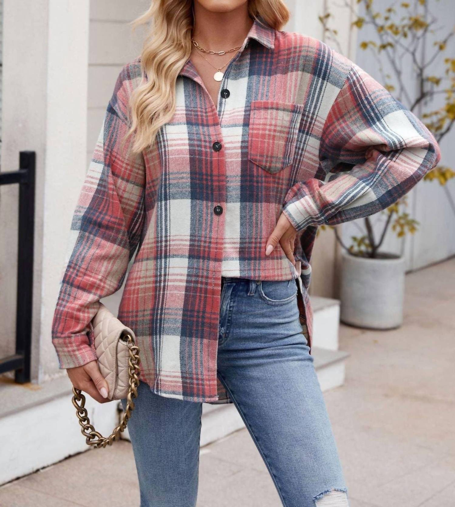 Enhance your autumn and winter wardrobe with the Plaid Button Up by Lovesoft, a charming flannel top in a delightful pink plaid print. This women's button-down features long sleeves and a casually oversized fit, complete with a single breast pocket and collar for added style. Material: Wool Blend. Closure: Button closure. Care: Machine wash and tumble dry.