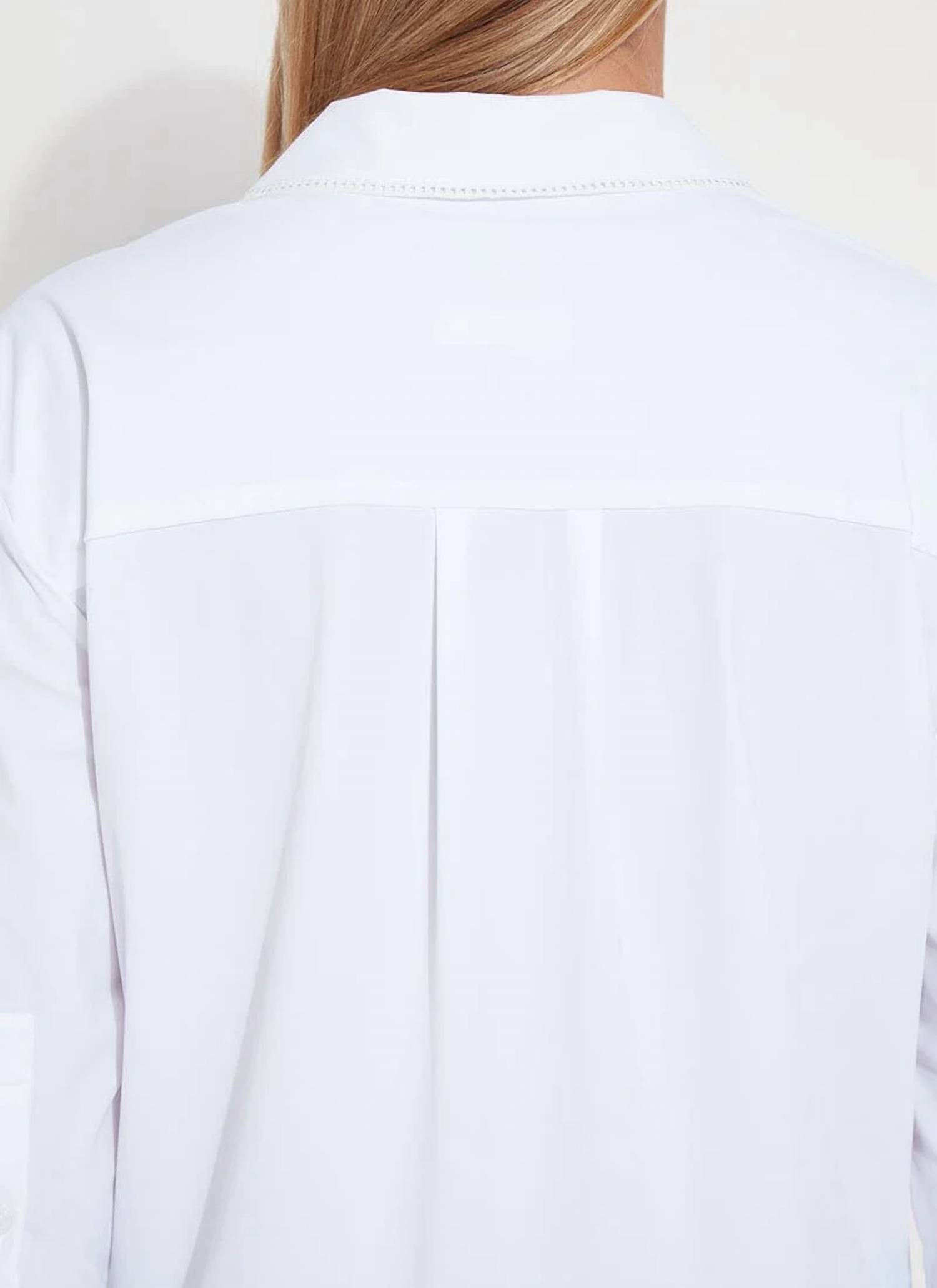 Pair this with your favorite jeans and slides for your next girls night out. The Belynda Button Blouse by Lysse is a versatile wardrobe staple designed in a crisp white solid pattern. Featuring three-quarter length sleeves and crafted from a 75% Nylon, 25% Spandex microfiber blend, this tunic offers a relaxed fit with 4-way stretch for superior comfort. Thoughtfully designed with a button closure, this top includes a high-low hem, tasteful eyelet trim on the collar placket, and functional pocket detailing. Care for this piece is simple with machine wash and line dry instructions. The model is 5’10” and wearing a size small.