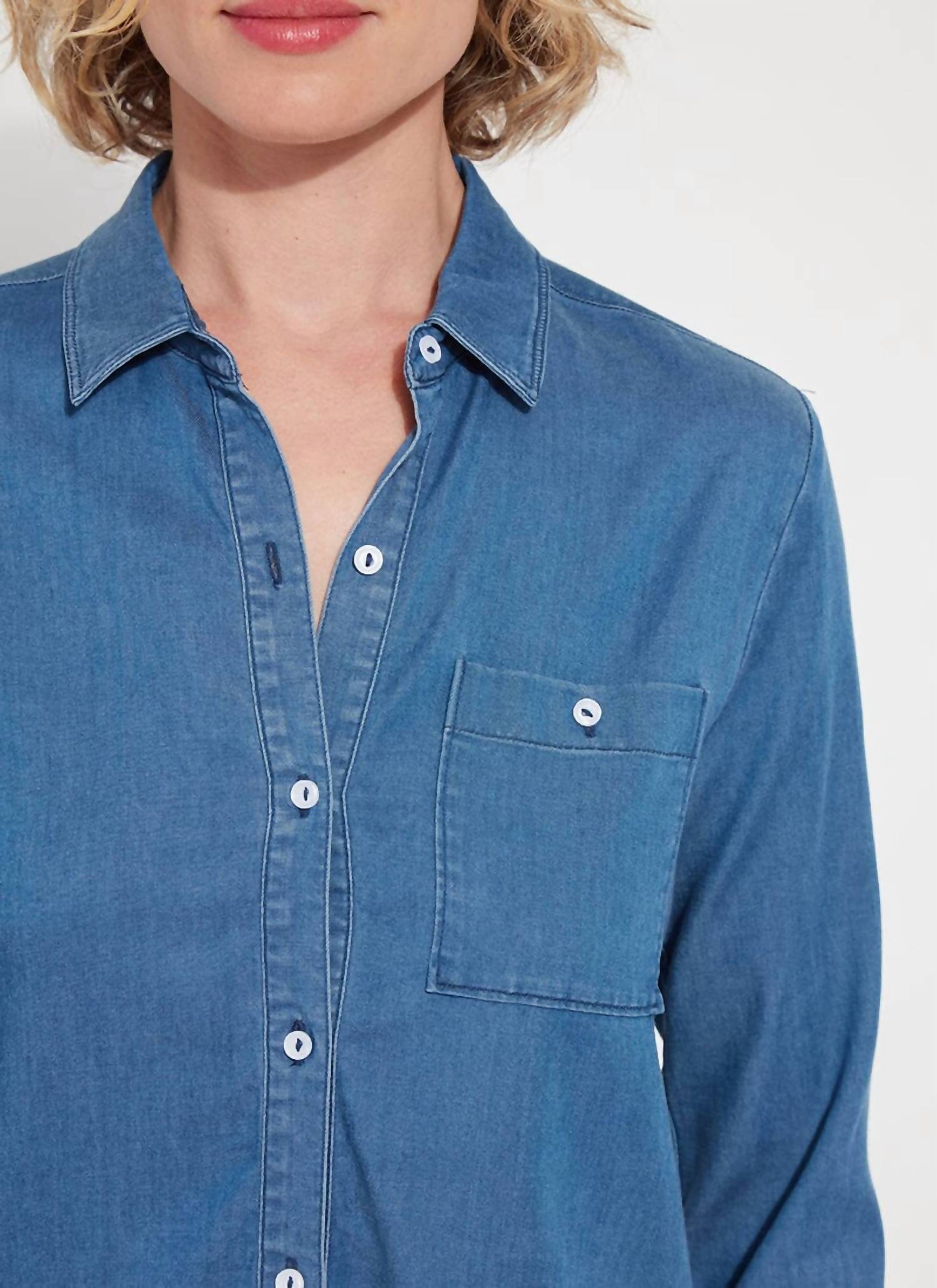 Perfectly tailored and soft to the touch. Discover the Drew Chambray Shirt by Lysse, a Mid Wash essential in every woman’s closet. This shirt features long sleeves with mini cuffs and is crafted from a blend of 63% Tencel, 25% Polyester, 11% Viscose, and 1% Spandex for ultimate comfort with 2-way stretch. It includes a practical front pocket, button closure, and is complete with a collar and rounded shirttail hem. Caring for your garment is easy with machine wash instructions and line dry recommendations. Model is 5’10” and wears a size S.