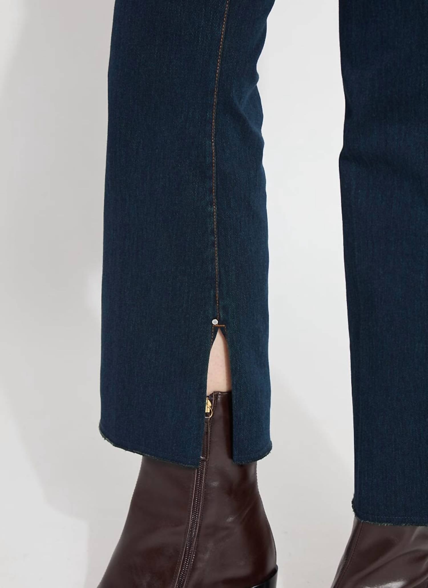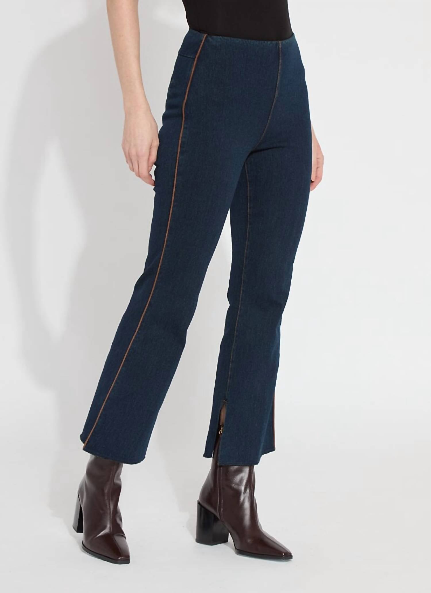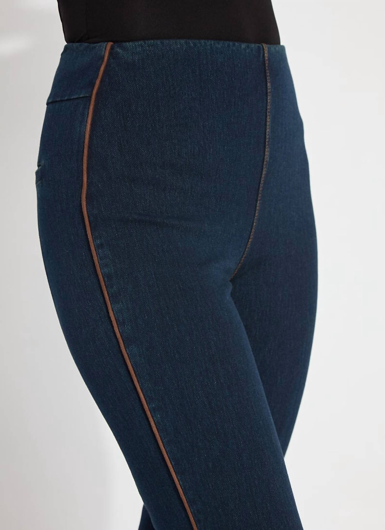 Slightly flared pants are all the rage right now and these are no exception. Pair these with your favorite tee for a more casual look, or with your favorite button-up blouse for an evening out. Introducing the Eloise Slim Flare Pant with Piping by Lysse, crafted in versatile Indigo with a flattering high-rise fit. These pull-on pants boast a cotton blend composition with 95% Cotton and 5% Spandex, delivering 4-way stretch for added comfort. Eye-catching features include Vegan Suede piping along the shifted side seams and raw-edge hems for a modern touch. Designed for women, these pants come with a 28" inseam and are machine washable with line dry instructions. Model is 5’10” and is wearing size S.