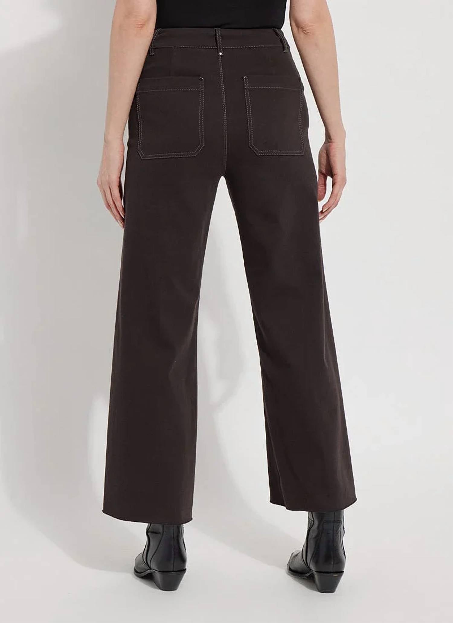 Introducing the Erin Hi Waist Wide Leg Denim Pant by Lyssé, crafted in a rich Espresso color designed for modern sophistication. These jeans feature a high-waisted, pull-on fit with a relaxed, wide-leg style that skims the waist and thighs. Made from 4-way stretch Knit Denim, comprising 95% cotton and 5% spandex, they offer a concealed patented 360 smoothing waistband and a raw-edge hem that's easy to tailor. With an inseam of 28 inches and back patch pockets adorned with gunmetal studs, these wide-leg jeans combine comfort and style, perfect for versatile wardrobe pairing. Care: Machine wash and line dry. Model is 5'10" wearing size S.