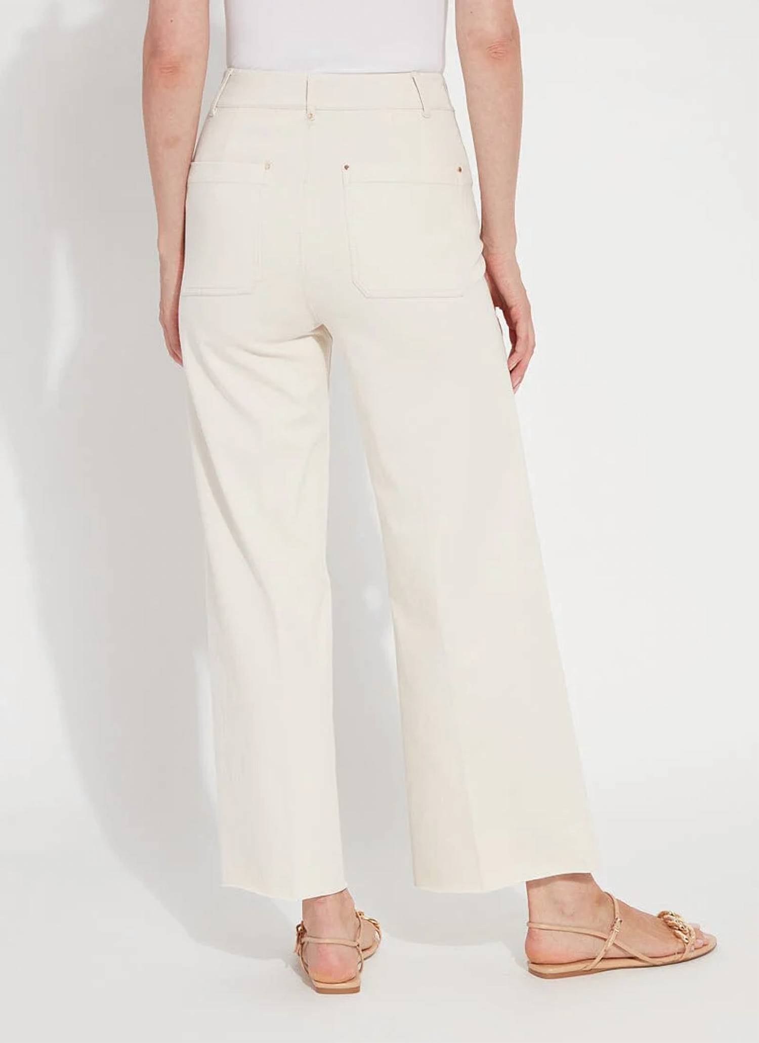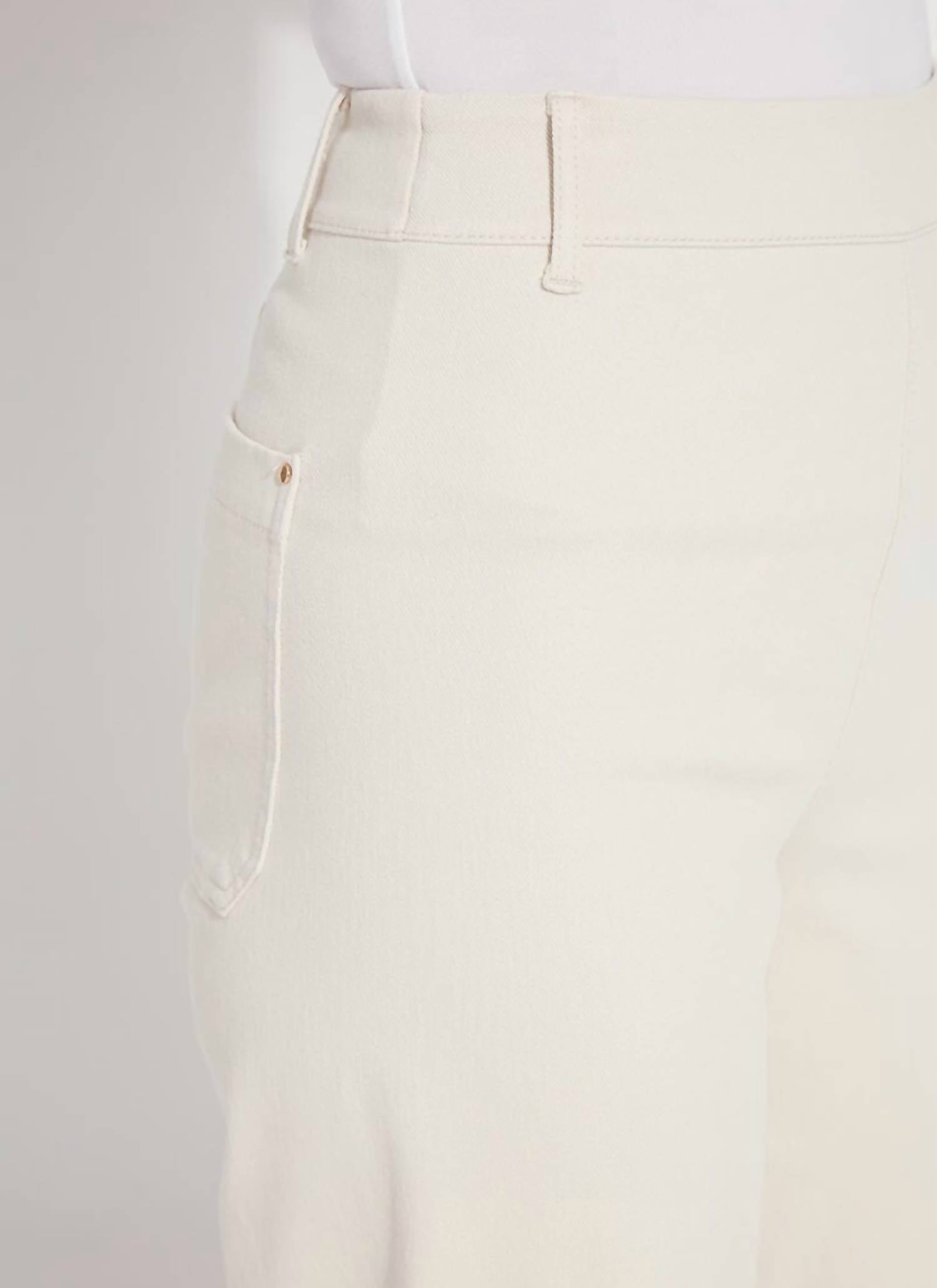 Introducing the Erin High Waist Denim Pant by Lyssé in an oat hue, designed for those who seek both comfort and style. These high-rise, wide-leg jeans are crafted from 4-way stretch Knit Denim with a composition of 95% cotton and 5% spandex, featuring a Lyssé concealed patented 360 smoothing waistband for a flattering fit. With back patch pockets adorned with gunmetal studs and a raw-edge hem that can easily be shortened, these jeans offer a 28" inseam in a cropped, ankle length. Closure: Pull on. Care: Machine wash, line dry. Model is 5’10” wearing size S.