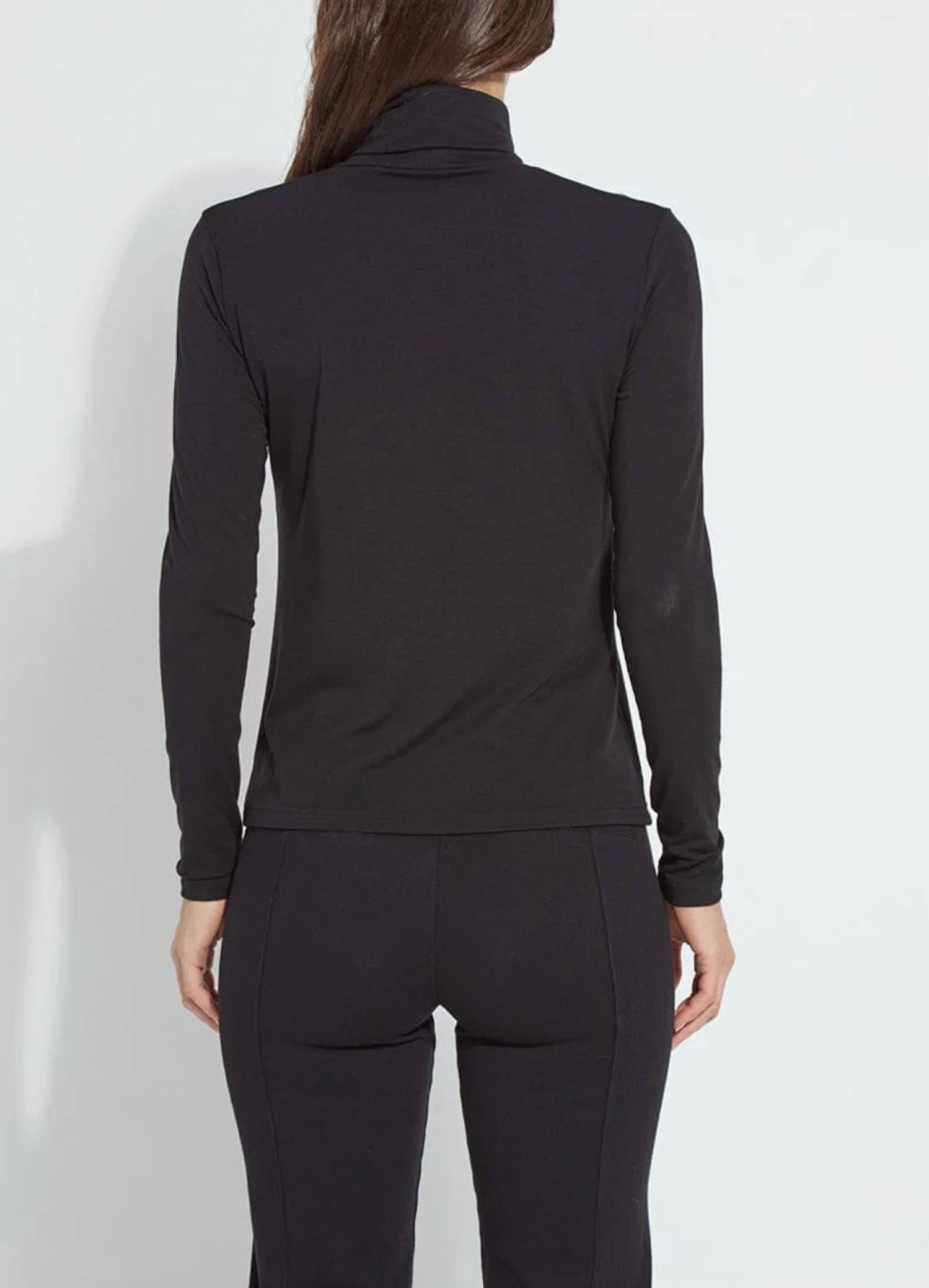 Introducing the Essential Longsleeve Turtleneck Tee by Lysse, a must-have addition to your fall and winter wardrobe. This black, long sleeve tee is crafted from a 4-way stretch blend of 61% Polyester, 34% Rayon, and 5% Spandex, providing a relaxed fit that feels both soft and stretchy. The high turtleneck neckline adds a touch of elegance to its solid design. Closure is by pull-on, and it's conveniently machine washable with a line dry, making it perfect for stylish travel or office attire.