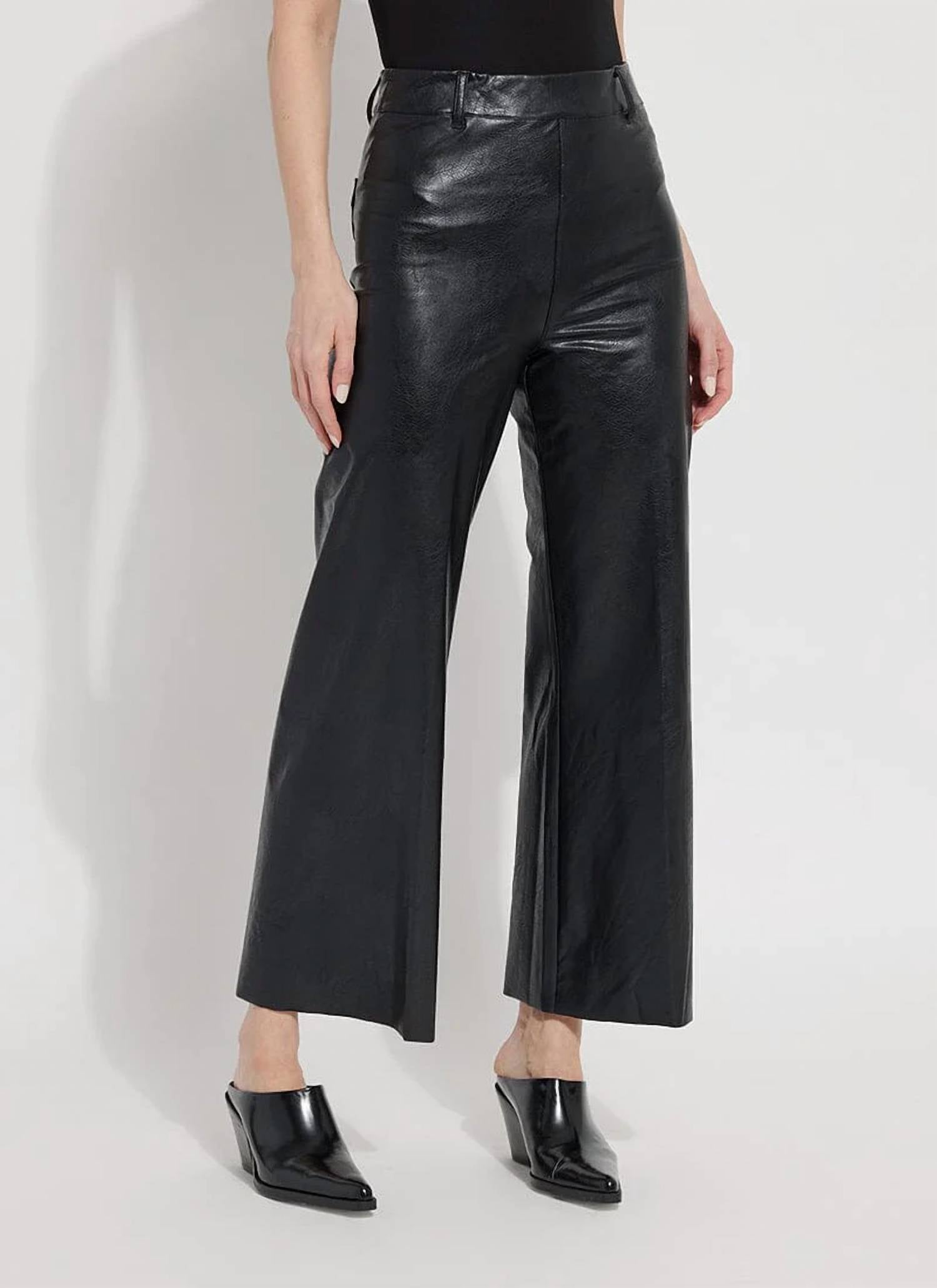 Meet the Hi Waist Vegan Leather Pant by Lysse, a sophisticated piece in Kohl Black designed for a chic and modern look. Crafted from 100% Polyurethane, these wide-leg pants are tailored with a high-rise waist and slim fit, offering a flattering silhouette with a concealed patented 360 smoothing waistband. These ankle-length pants feature convenient patch pockets, belt loops, and a pull-on closure, with no side seam for a sleek appearance. With a 28" inseam, care includes machine wash and line dry.