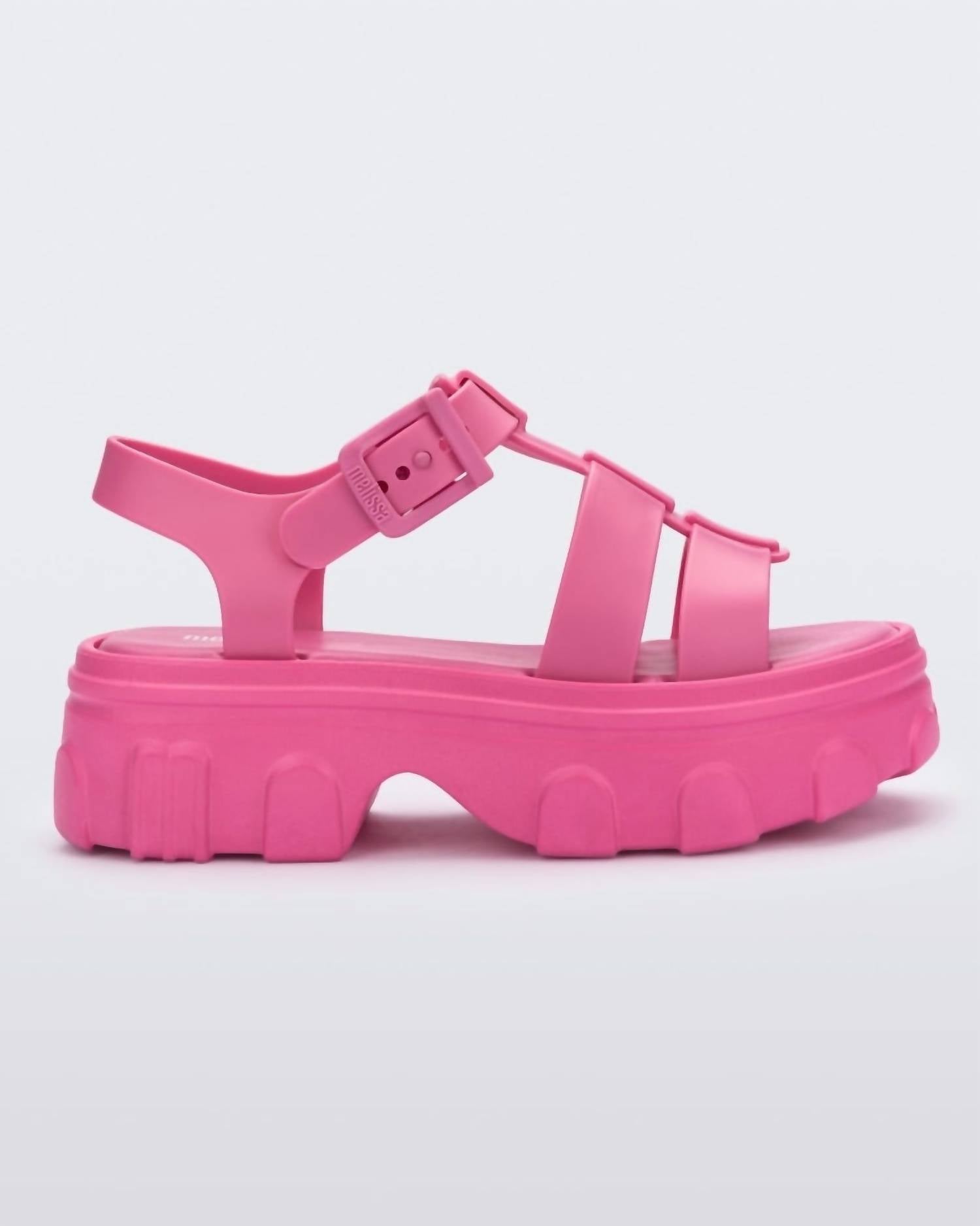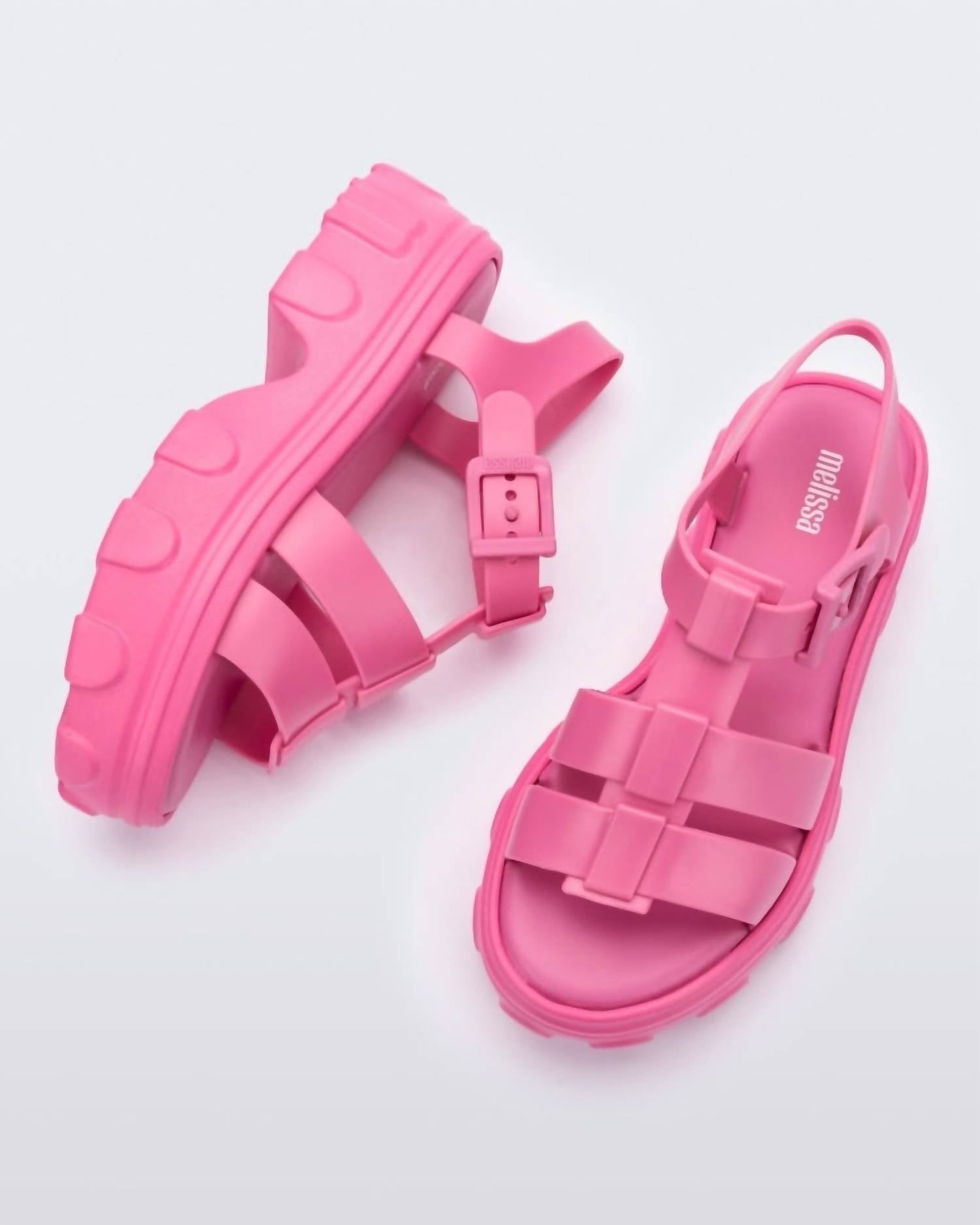 This sandal will take you from brunch to dinner and everything in between. Step into summer with the Melissa Ella Women's Sandal, a vibrant and stylish addition to your wardrobe. This pink, open-toe design showcases a maximalist fisherman-style upper with a chunky lug sole and a platform heel, capturing the essence of runway and streetwear trends. Perfect for vacation occasions, these sandals blend originality with comfort, ensuring you stand out in any setting. Elevate your summer looks effortlessly with this bold choice from the renowned Melissa brand.