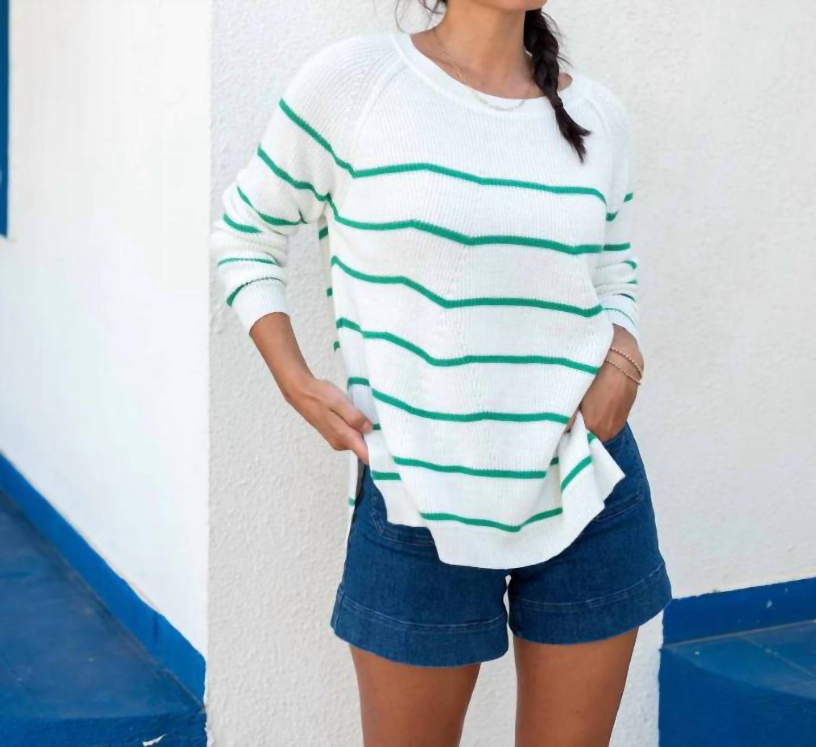 The ultimate go-to sweater, expertly crafted to provide the perfect combination of warmth and style. Its classic design and soft fabric make it a must-have addition to your wardrobe. Elevate your wardrobe with the Camden Pull-on Sweater by MERSEA, a perfect blend of sporty and preppy style in a crisp White + Jade Stripe. Crafted from 70% acrylic and 30% viscose, this versatile sweater features long sleeves and a classic crewneck, making it a staple for cooler seasons. Designed without pockets and featuring a convenient pull-on closure, it exemplifies both function and fashion. It has a design-only buttons at the back.Care is simple with machine washing and laying flat to dry, ensuring easy maintenance while maintaining its vibrant stripe pattern.
