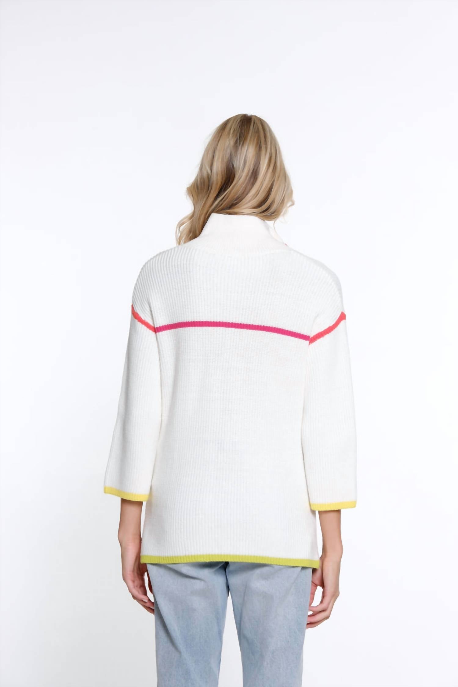 Wear this v-neck sweater with your favorite denim for the perfect fall look. Introducing the 3/4 Sleeve Drop Shoulder Collared Sweater by Multiples, a standout piece with a versatile white hue and textured pattern. This women's sweater features a soft, breathable cotton blend and a relaxed drop-shoulder fit for ultimate comfort. Designed with bold color block stripe detailing and a zip-through collar for adjustable styling, it's perfect for casual outings or layering in cooler weather. Embrace minimalist fashion with this piece, ideal for travel or St. Patrick's Day celebrations.