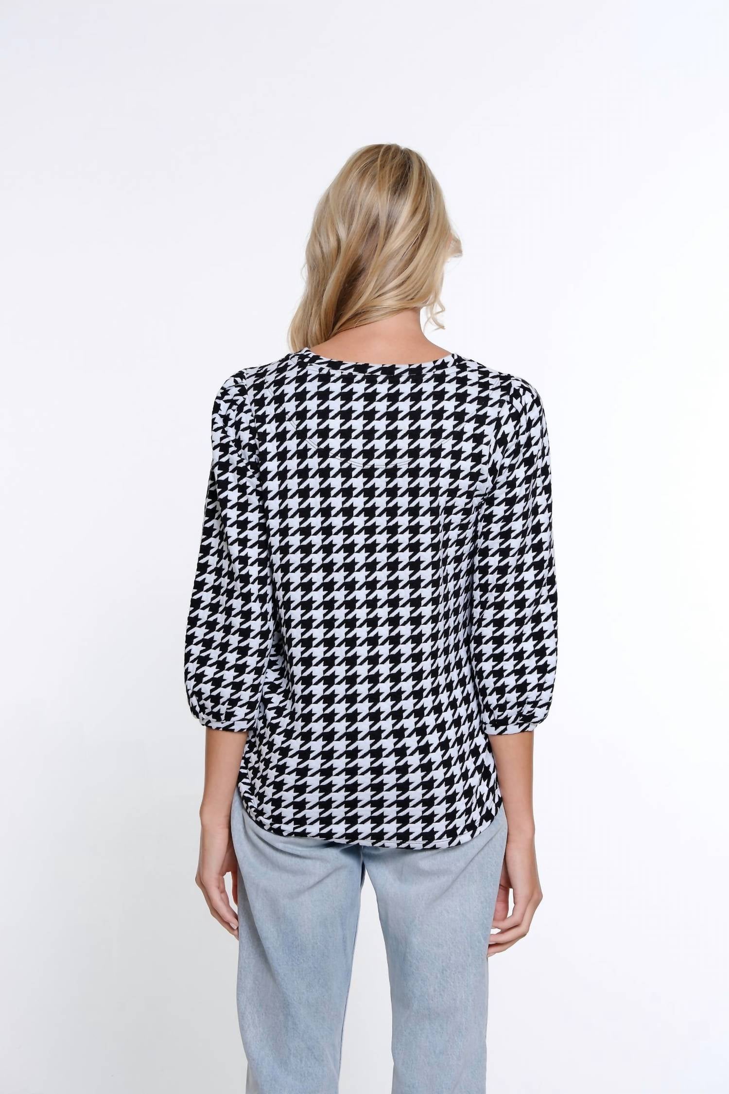 Discover the 3/4 Sleeve Scoop Neck Top by Multiples, an elegant choice for any wardrobe. This white blouse features three-quarter tuck sleeves and a flattering scoop neck crafted from a soft, durable Viscose/cotton/polyester blend. Pattern: Classic houndstooth jacquard. Closure: Pull on. Style it effortlessly with trousers or skirts for both casual and professional settings. Style #M15605TM.