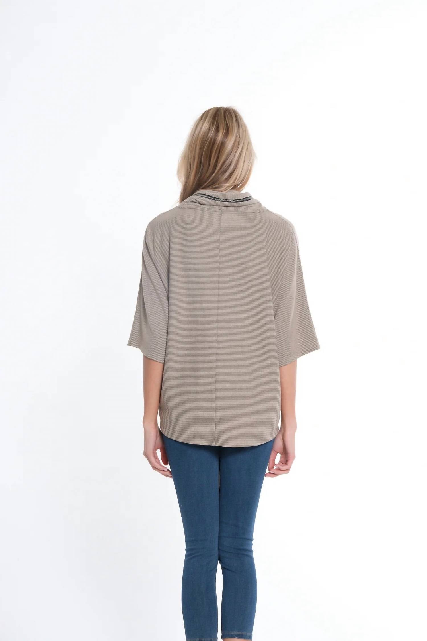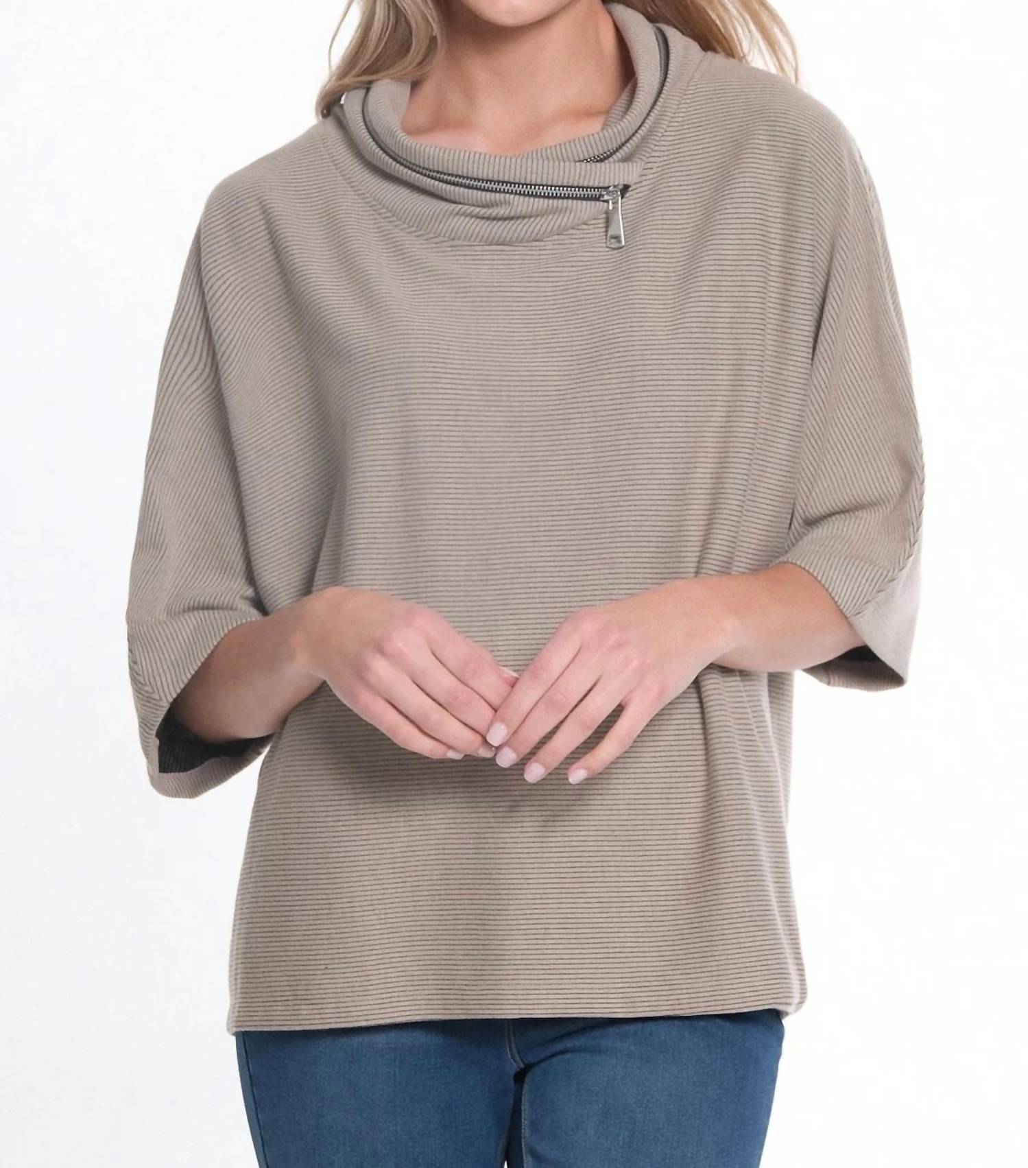 Pair this with your favorite jeans and slides for your next girls night out. Elevate your minimalist wardrobe with the Multiples Elbow Dolman Sleeve Zip Cowl Collar Hi-lo Top in a sophisticated stone hue. Designed with elbow sleeves, this blouse features a cowl neckline with a chic zip detail, crafted from 88% Polyester, 9% Rayon, and 3% Spandex. Made in Vietnam, this pull-on piece combines comfort and elegance with a dramatic hi-lo hem perfect for any church or casual fall outing. Care is simple with machine wash instructions.