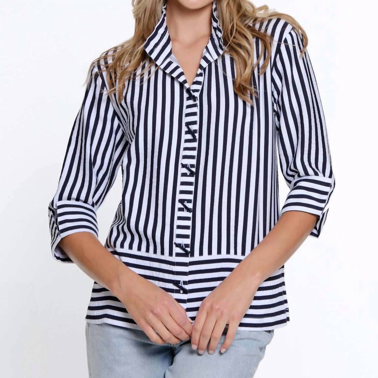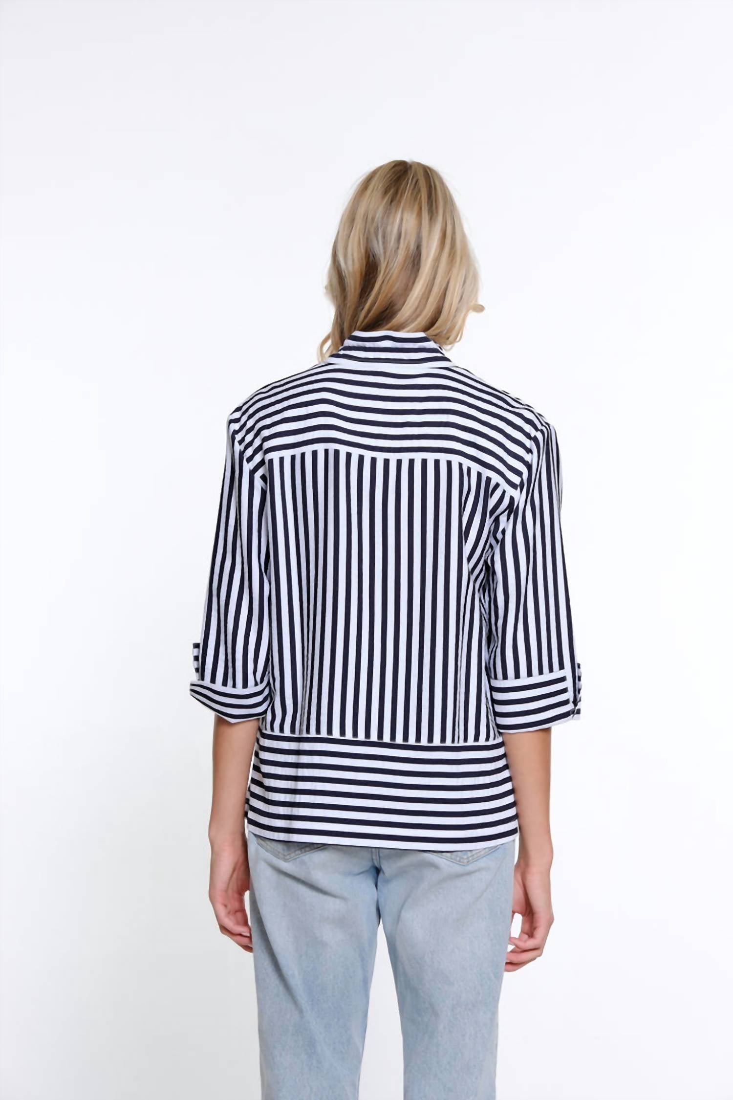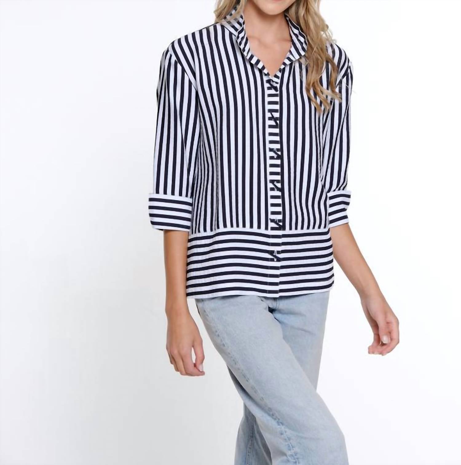 A classic button down shirt that will never go out of style. Embrace elegance with the Hungry Eyes Top by Multiples, featuring flattering three-quarter sleeves that end in a stylish turn-up cuff. This navy shirt, crafted from 85% rayon and 15% nylon, combines comfort with a chic striped pattern. Designed with a wire collar and button closure, it's perfect for any occasion. While specific care instructions are unavailable, this top remains a sophisticated addition to your wardrobe.