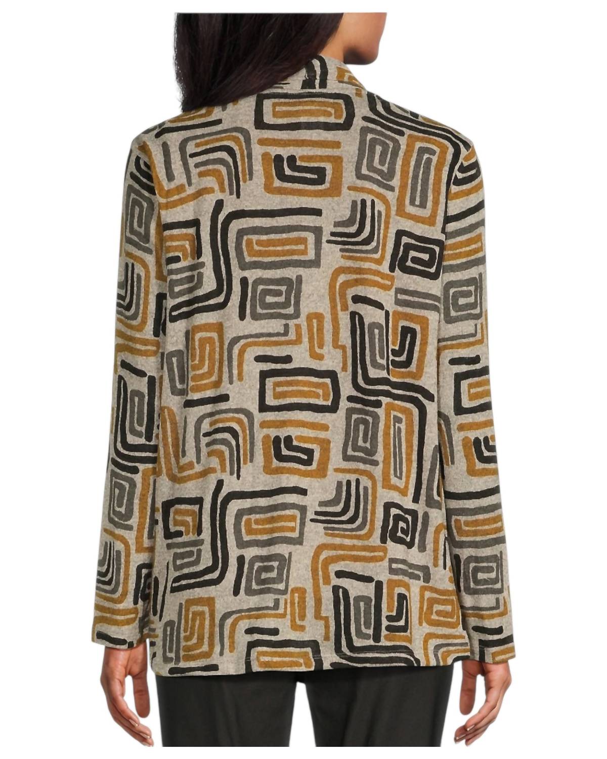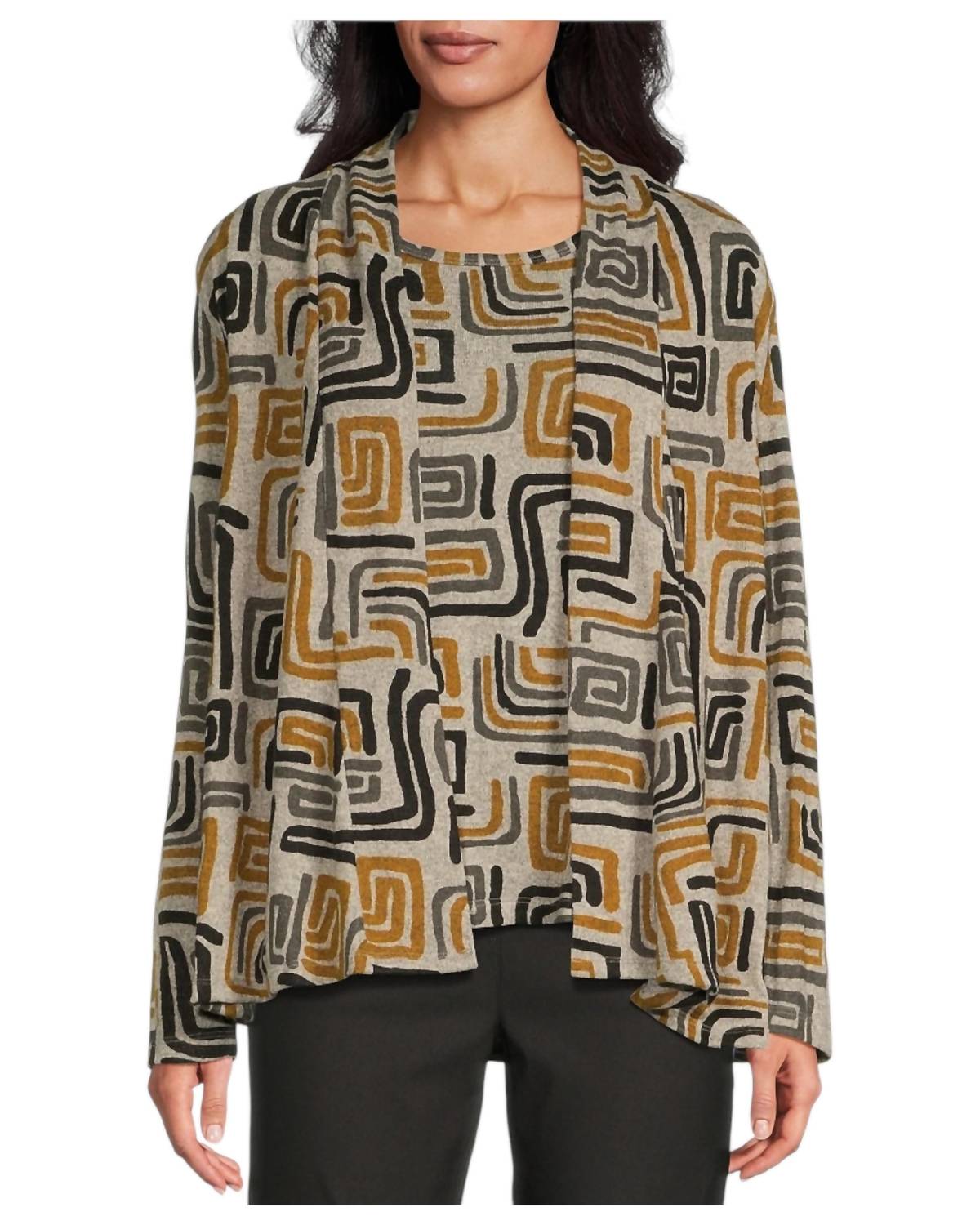 A set so cute you'll never want to take it off. Designed to look good while lounging, this little number is the perfect outfit for hanging at home in style. The Absmlt Jacket & Tank Set by Multiples offers a chic combination of style and comfort in a vibrant abstract multi design. This loungewear set for women is crafted with long sleeves and features a geometric pattern. Made from 95% polyester and 5% spandex, it promises a comfortable stretch and easy maintenance. Care for this set is simple: machine wash cold and tumble dry on low heat.