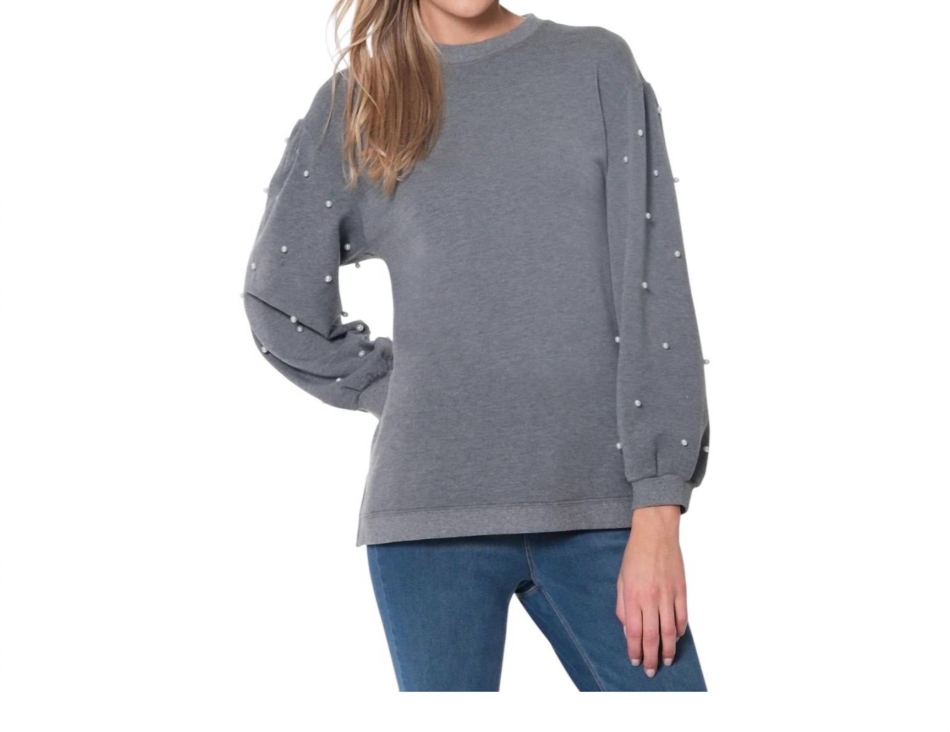 Stay warm and stylish in this versatile and effortlessly cool knitwear staple. Wear it alone or layered, it's the perfect sweater for the season and you'll wish you had it in every color. Introducing the Pearl Embellishment Sweater by Multiples, a chic addition to any wardrobe in a sophisticated grey hue. This women's sweater features a classic crewneck and long sleeves, perfect for cooler seasons. Adorned with elegant pearl embellishments, it adds a touch of glamour to your ensemble. Crafted without pockets or closures, it offers a clean, streamlined look.