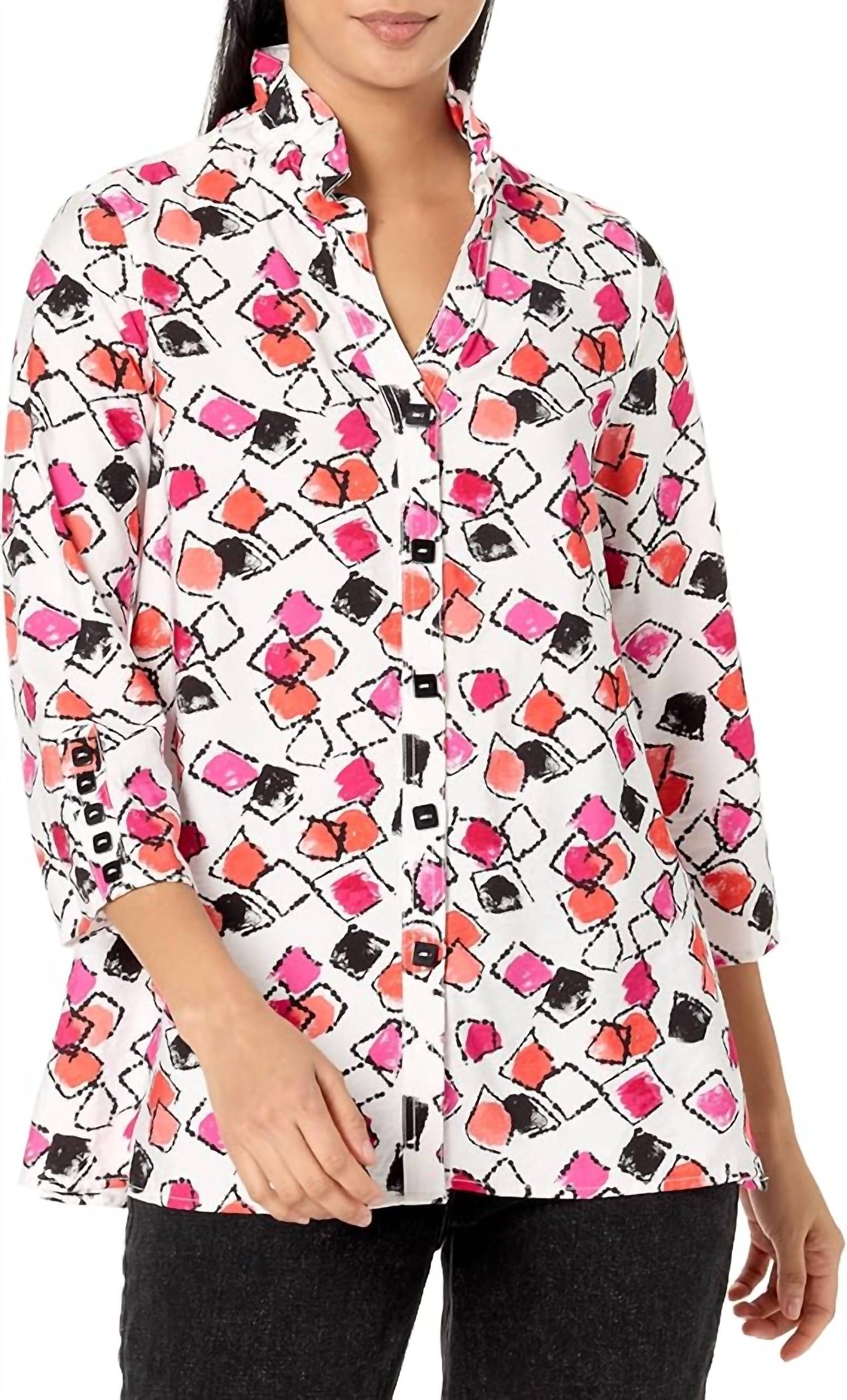 A classic button down shirt that will never go out of style. Elevate your spring wardrobe with the Wire Collar Button Front Shirt by Multiples, a stylish button-down option for any occasion. Crafted from a comfortable nylon blend, this shirt features three-quarter sleeves and a classic collar neckline. Its vibrant multi-colored graphic pattern adds a lively touch to your ensemble. Designed without pockets and secured with a button closure, it's a fuss-free choice for a housewarming gathering.