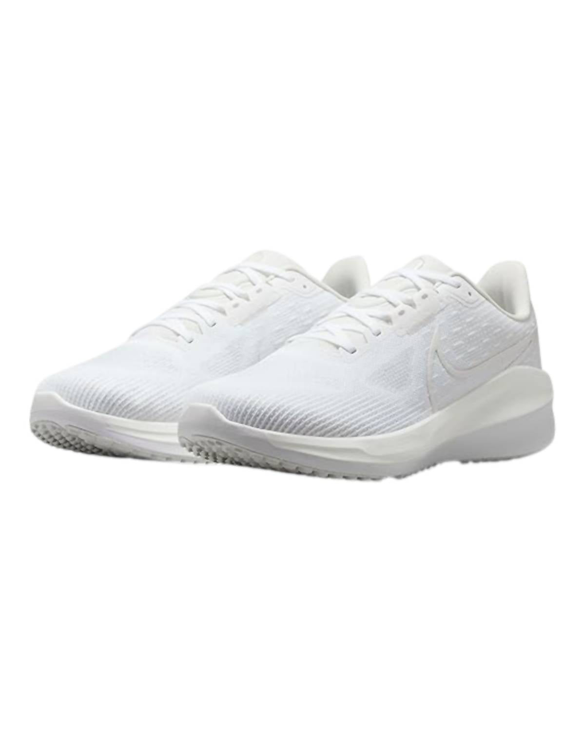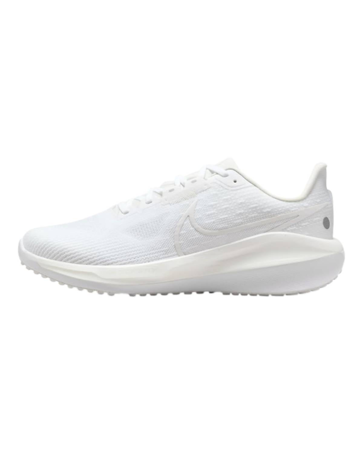 Introducing the Men's Vomero 17 Shoes by NIKE, perfect for those seeking comfort and performance. These athletic shoes come in a stylish white and platinum tint-summit white color scheme, featuring a round toe design for ease of movement. Crafted with durable rubber, they are designed to withstand rigorous activities. Ideally suited for adult men, these shoes promise both style and practicality for any sports enthusiast.