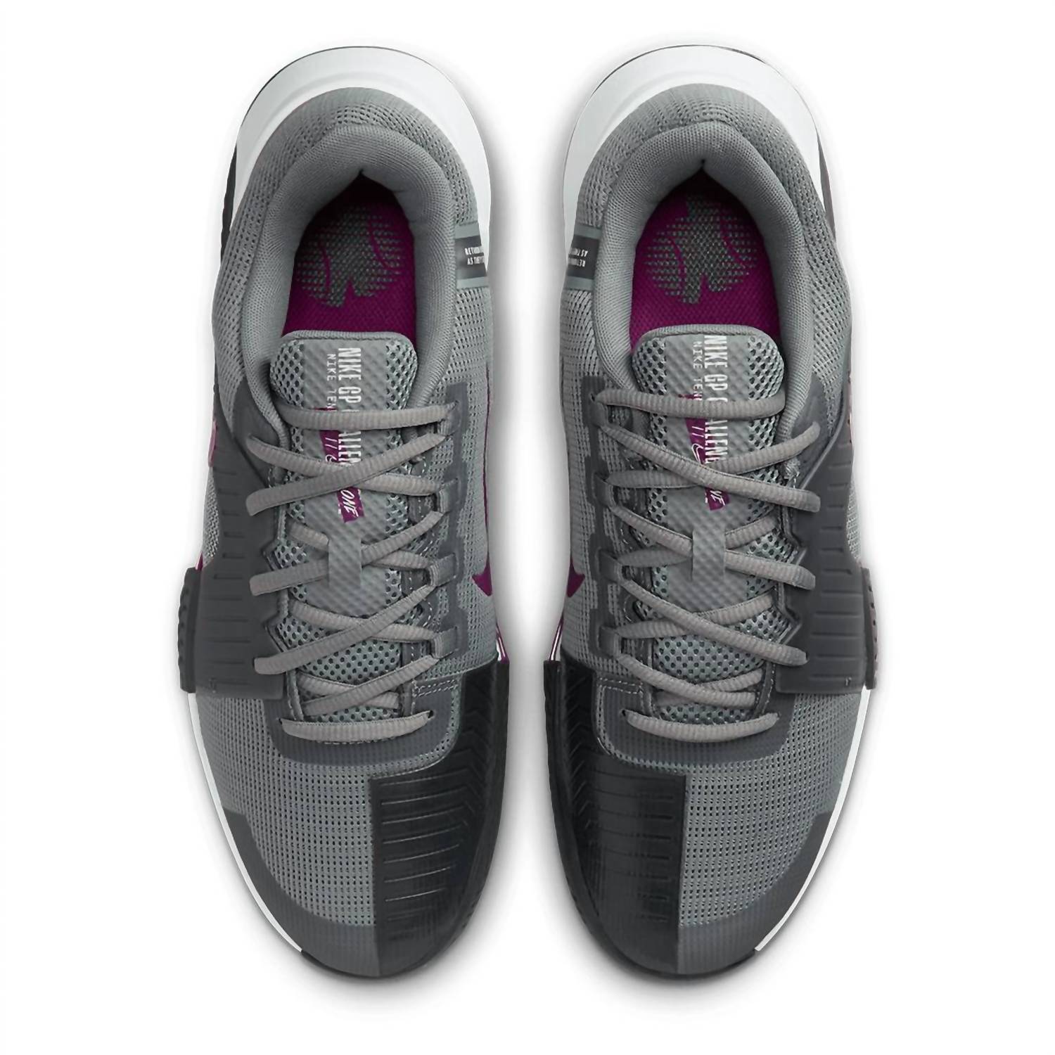 Experience unparalleled stability with the Men's Zoom GP Challenge 1 Shoes by Nike, crafted for athletic performance. The innovative design features a TPU cage upper for adaptable containment and a traditional U-throat for easy adjustments. With a midfoot TPU plate, Air Zoom units, and high-abrasion rubber outsole, these shoes offer power, comfort, and traction. Perfect for hard court surfaces, it comes in Smoke Grey/Sangria with a flat heel and round toe shape, enhancing both style and function for your active lifestyle.