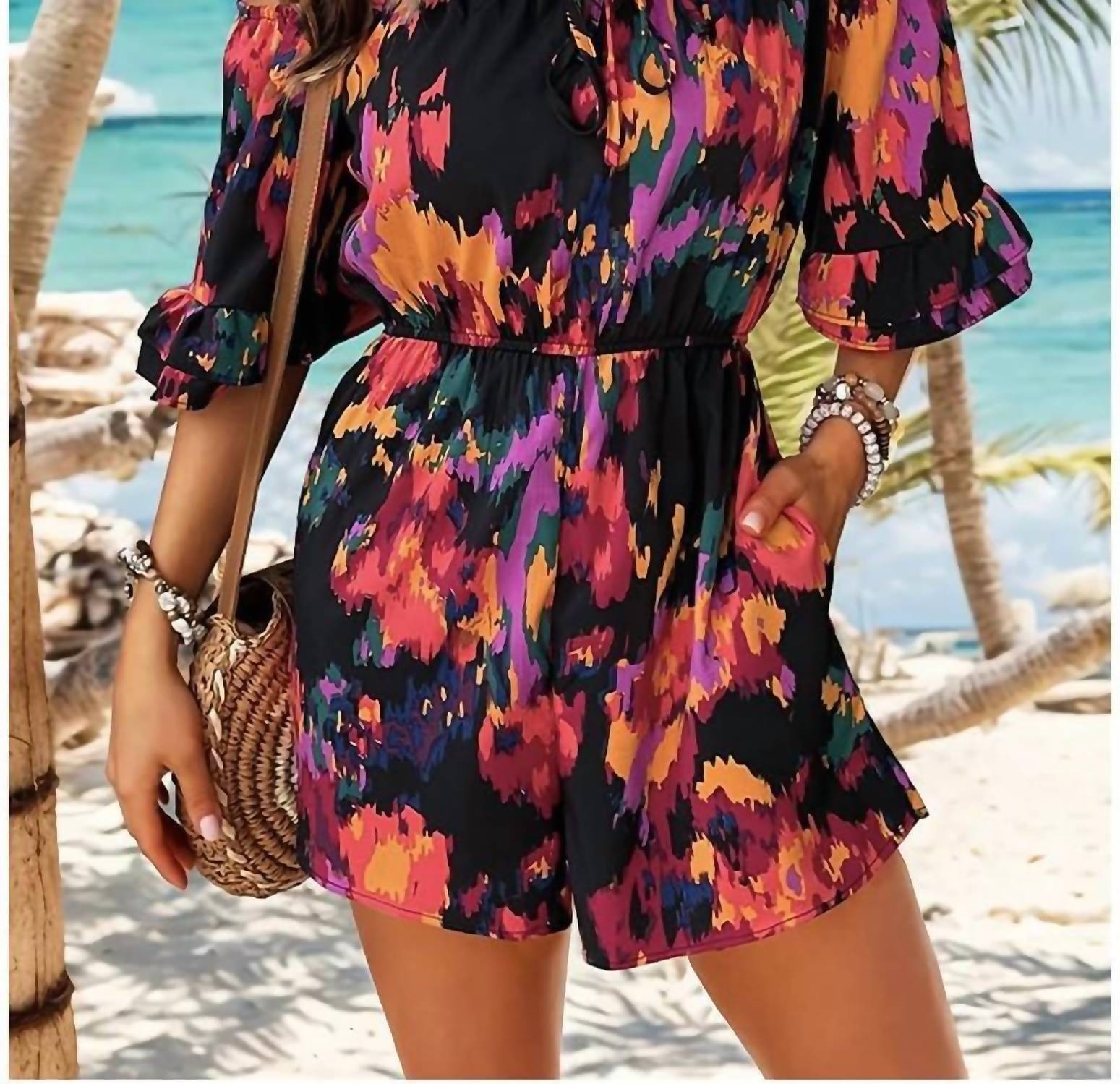 Embrace bold style with the Off-shoulder Printed Romper by Ninexis, a vibrant addition to any wardrobe. This multi-patterned romper features a unique lotus leaf sleeve design and a flattering high-waist for a chic look. Crafted from smooth polyester, it offers a wide-leg style and convenient pull-on closure, while also boasting functional pockets. Care is simple with machine wash instructions, making it a practical yet stylish choice for women.