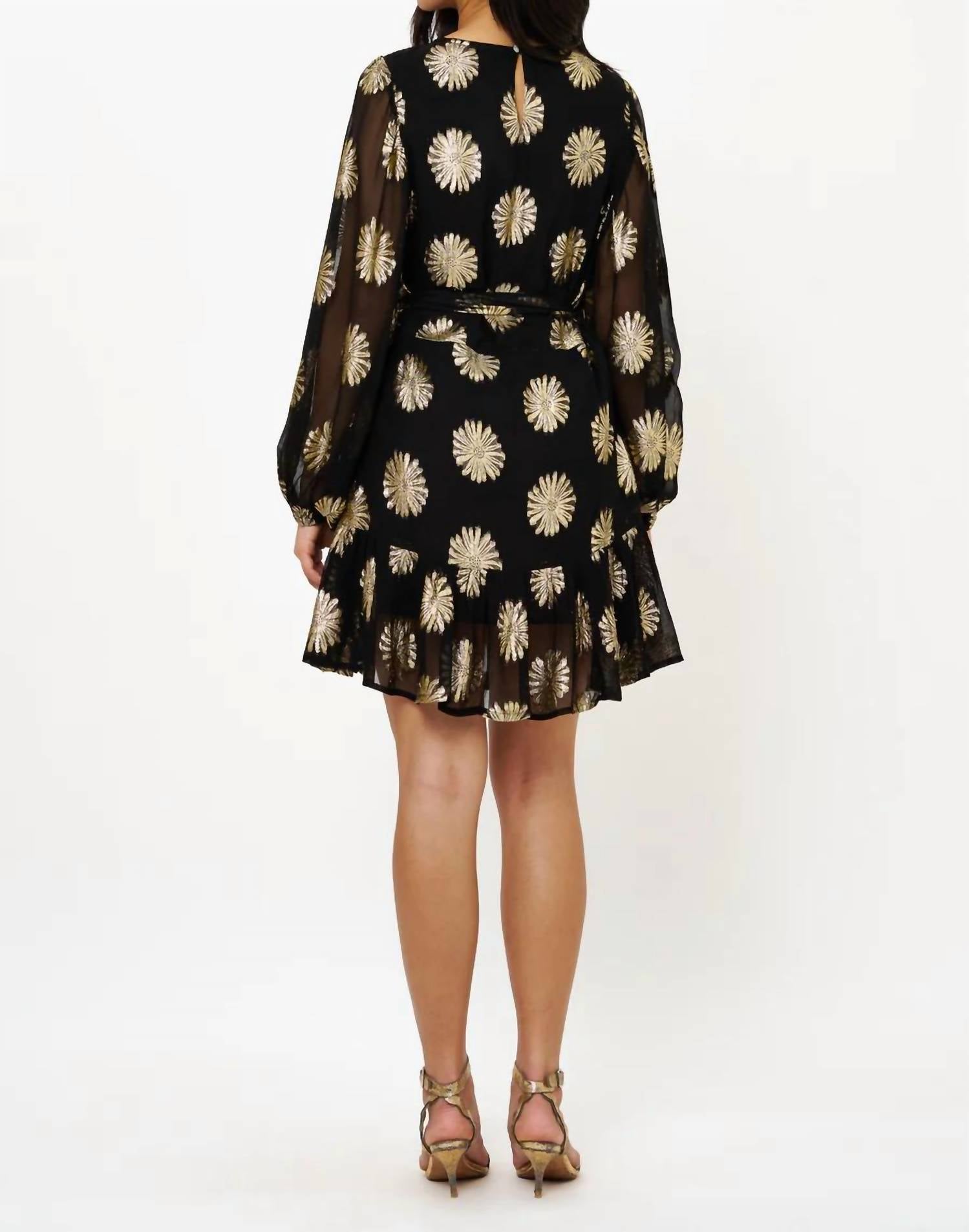 Indulge in the Flirty Short Floral Dress by Oliphant, a sophisticated piece in Peony Black with delicate detailing. Crafted from luxurious Georgette Viscose, this mini dress features long balloon sleeves with elasticized cuffs and a chic boatneck neckline. The dress is adorned with jacquard florals in gold lurex thread, offering a touch of elegance. With a button keyhole closure and a relaxed fit, care is simple with hand wash in cold water and gentle detergent.