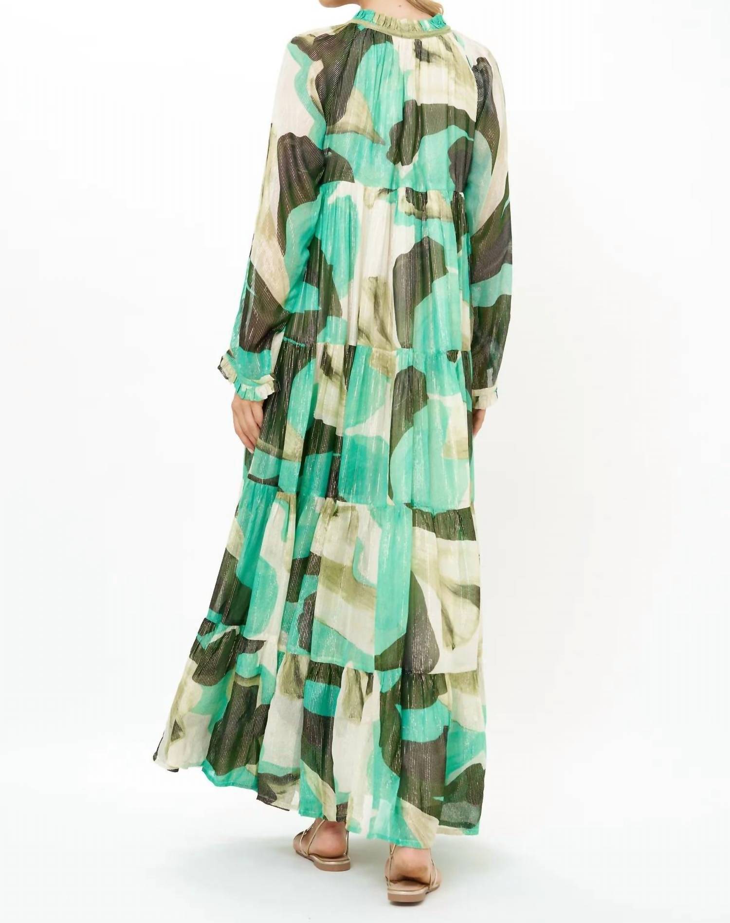 Style this maxi with your favorite statement necklace and sandals for the perfect look. Discover the Long Sleeve Tassel Maxi Dress by Oliphant in vibrant Ginkgo Green, the ultimate choice for making a statement. Crafted from flowing georgette viscose, this tiered trapeze maxi dress features a round collar adorned with pleated ruffles and tassel ties with a hook and eye closure. The long bell sleeves are sheer and detailed with ruffles, complementing the relaxed fit of this pull-on style. Care instructions include dry cleaning or gentle hand washing, with a recommendation to lay flat or hang dry and avoid prolonged sunlight exposure.