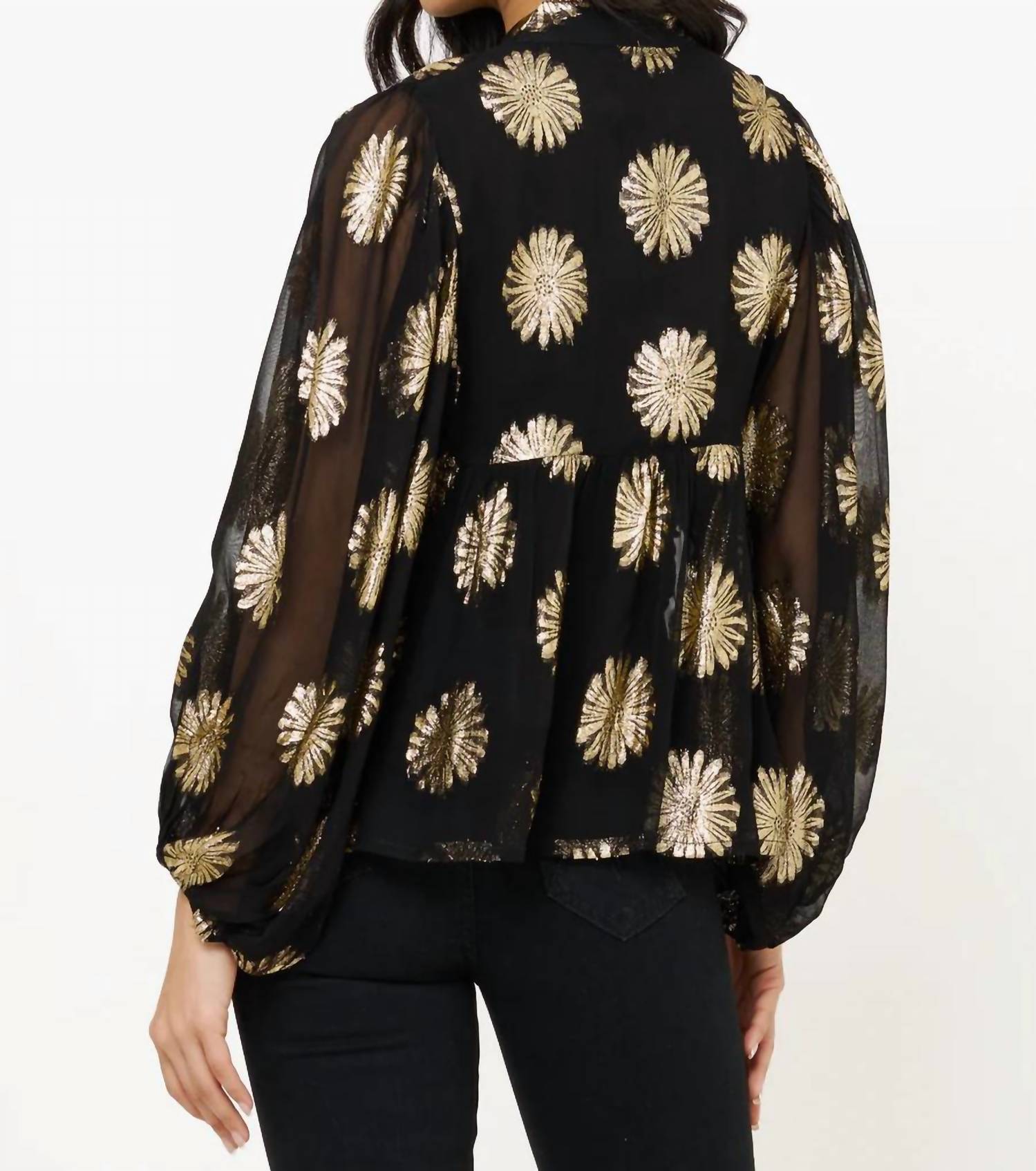 A timeless blouse that will never go out of style. Elevate your wardrobe with the Mandarin Balloon Floral Top by Oliphant, showcasing an eye-catching Peony Black print. This blouse features long balloon sleeves with elasticized cuffs and a mandarin collar with button closure, perfect for a sophisticated ensemble. Crafted from georgette viscose and adorned with jacquard florals in gold lurex thread, it includes a sheer peplum hem and a cotton lining bodice. Hand wash cold with gentle detergent, turn inside out before washing.