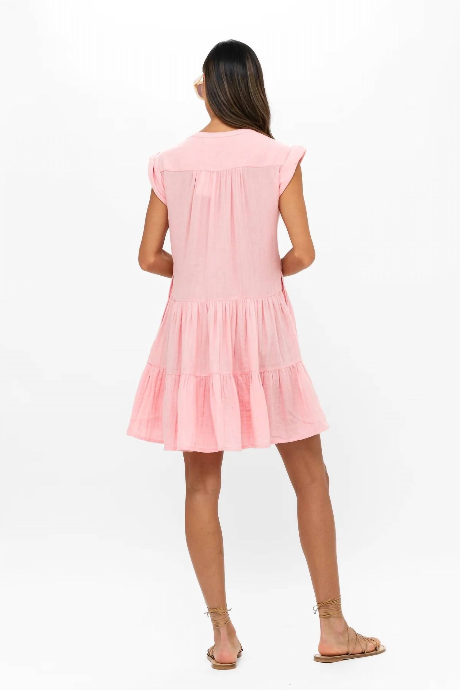 The kind of easy and flattering dress you'll be reaching for all season long. Introducing the Roll Sleeve Dress by Oliphant Designs in Bahama Pink, an ideal choice for warm weather with its airy cotton gauze fabric. This mini A-line dress features cap sleeves with a secured roll-up design, a flattering V-neckline, and convenient pockets. Closure: Pull-on style for easy wear. Care: Machine wash on a cold delicate cycle with gentle detergent, and lay flat to dry. Model is 5'9" and wears a size small.