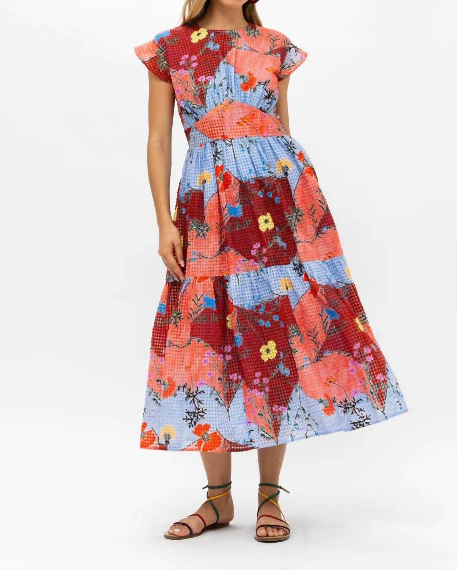 Presenting the Stockholm Midi Dress by Oliphant, a stunning piece in a vibrant sienna floral pattern. Featuring cap sleeves and a crewneck, this dress boasts a sophisticated tailored empire waist and an elegant tiered A-line silhouette. It is crafted from specialty open weave cotton and includes a hidden zip closure down the back. Care for this beautiful dress by washing it on a cold delicate cycle; lay flat to dry or hang and always turn inside out before washing if adorned with appliqués or gold-painted detailing.