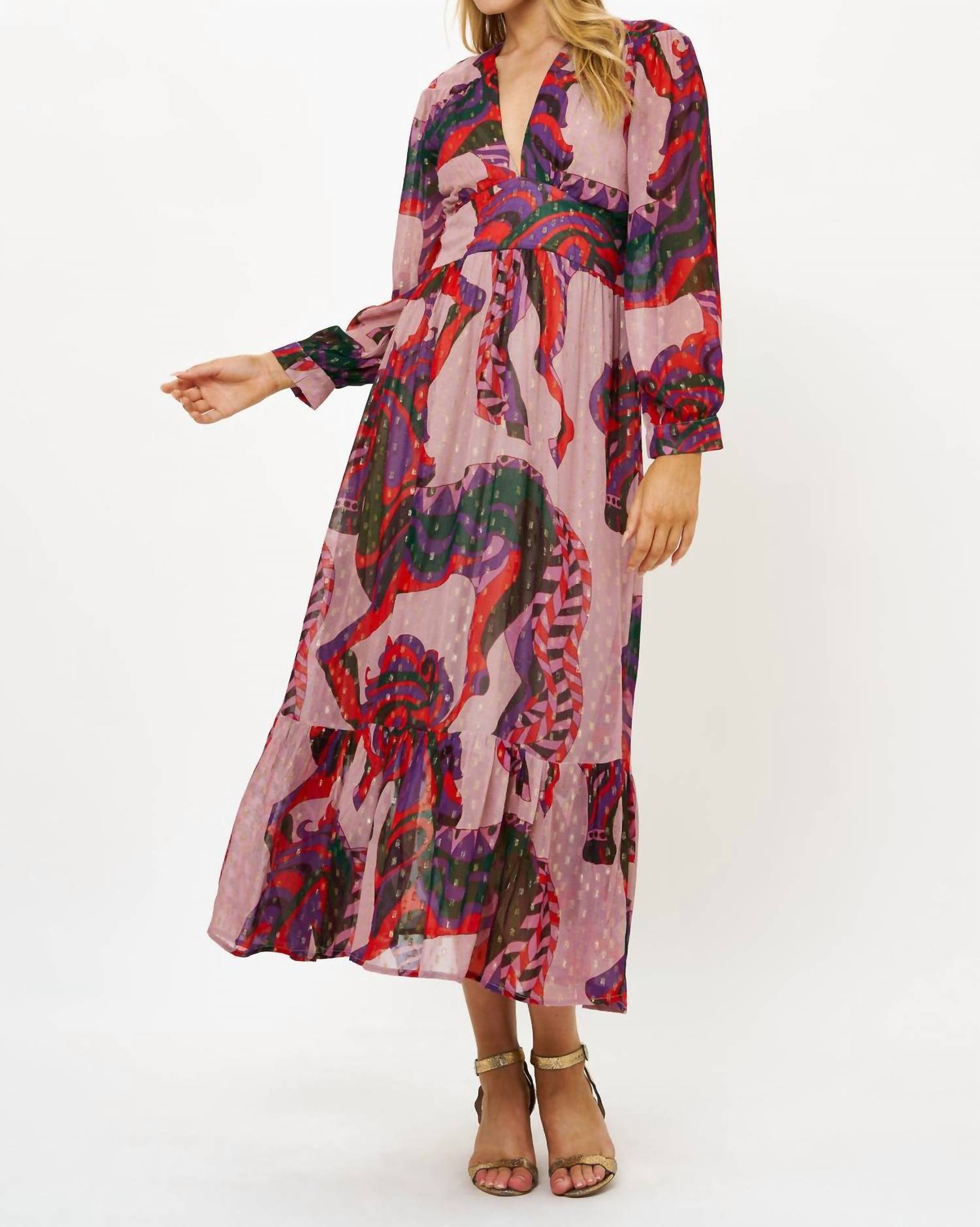 Who doesn't love a good maxi dress? This one you'll be reaching for season after season. Introducing the Tie Back Maxi Dress by Oliphant, a statement piece in an eye-catching Arabia/Crimson graphic pattern. Crafted from georgette viscose and embellished with gold lurex thread, it boasts long sleeves with tailored cuffs and a flirty maxi hemline. The V-neckline features a hook and eye closure, while a fitted bodice with smocking detail cinches the waist, highlighted by an attached tie back belt. Care for this pullover style with a gentle hand wash in cold water, laying flat or hanging dry, and turning it inside out before washing.