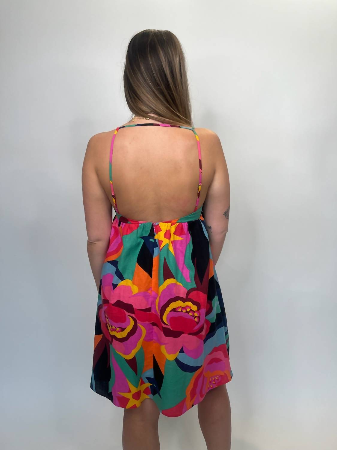 The perfect mini dress for those warmer months. Step into spring with the Floral Mini Dress by Olivaceous, a captivating piece with spaghetti straps and a flattering A-line silhouette. Made from a linen blend of 55% linen and 45% rayon, this dress radiates a bold multi-color floral pattern, perfect for any beach day or Easter celebration. A playful open back complements the zip closure for an extra touch of style, while the squareneck adds a chic edge. Care instructions include hand washing with mild detergent and hang drying to maintain its boho chic appeal.