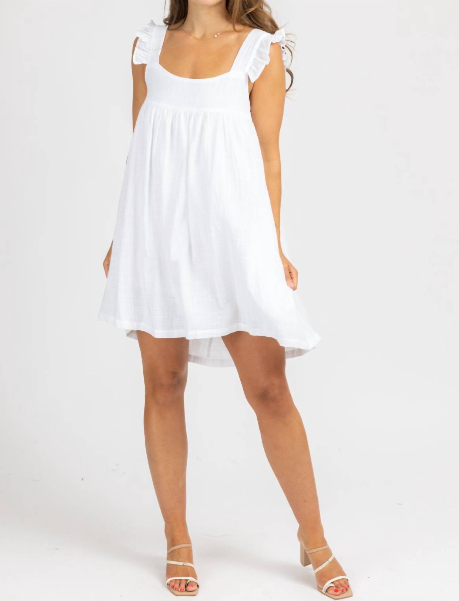 The perfect mini dress for those warmer months. Woven, relaxed fit, mini dress, ruffle detailed straps, pockets. 100% cotton. The model is wearing a size small, height 5'9, and the dress size 4/6.