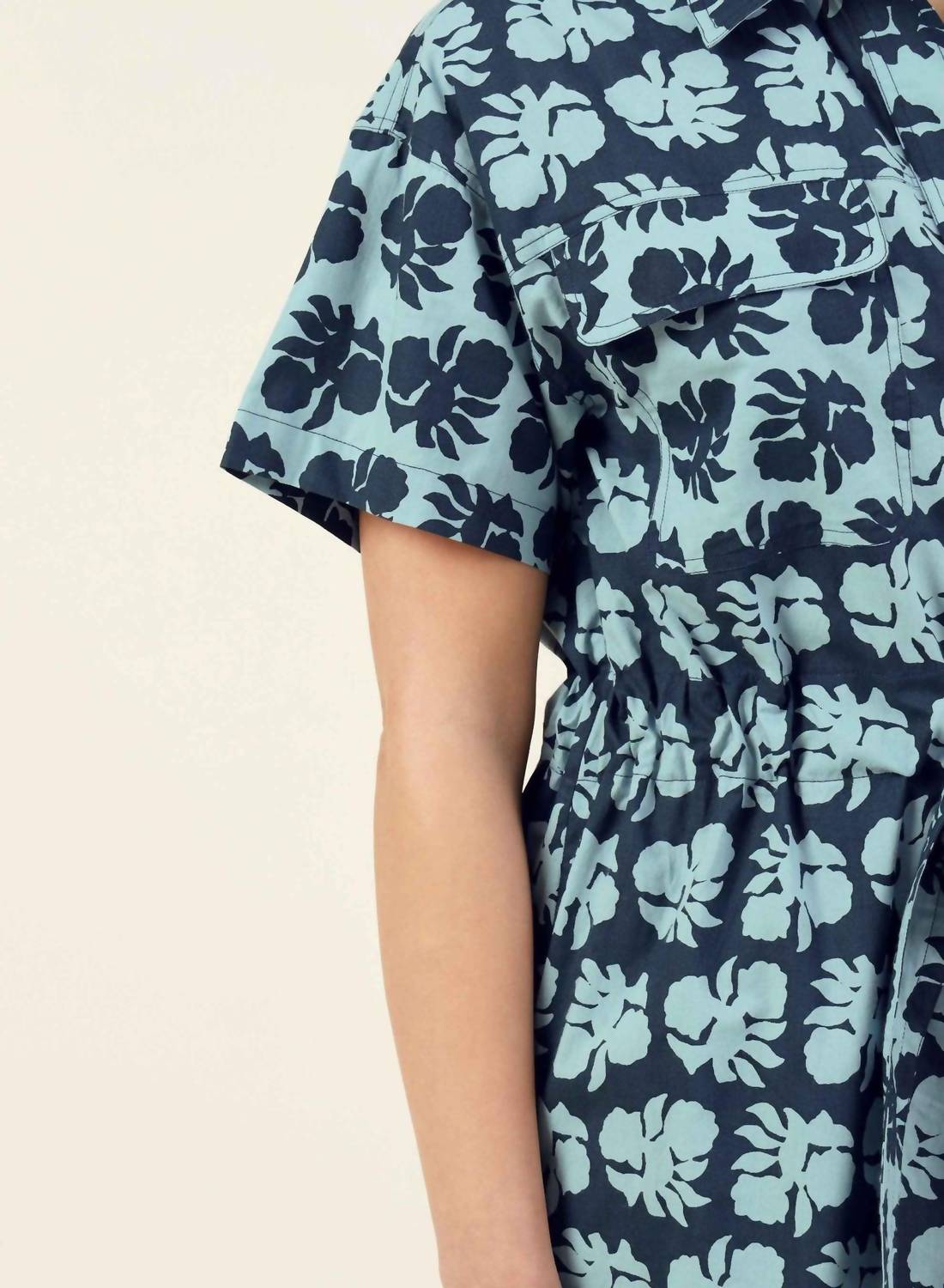 The kind of easy and flattering dress you'll be reaching for all season long. Embrace effortless style with the Carla Mini Dress by OMIKA, featuring a hand-painted Akola Storm floral print. This short-sleeved, A-line shirt dress is made from 100% cotton, offering comfort and breathability for your vacation yet maintains a chic boho aesthetic. It comes with a tie closure and an adjustable waist belt, adding a personalized fit while enhancing your natural silhouette. Designed with a shirttail hem and elastic at the back, it promises easy wear, and its collar neckline lends a classic touch. Ideal for spring outings, the dress is machine washable and perfect for those seeking both style and practicality.