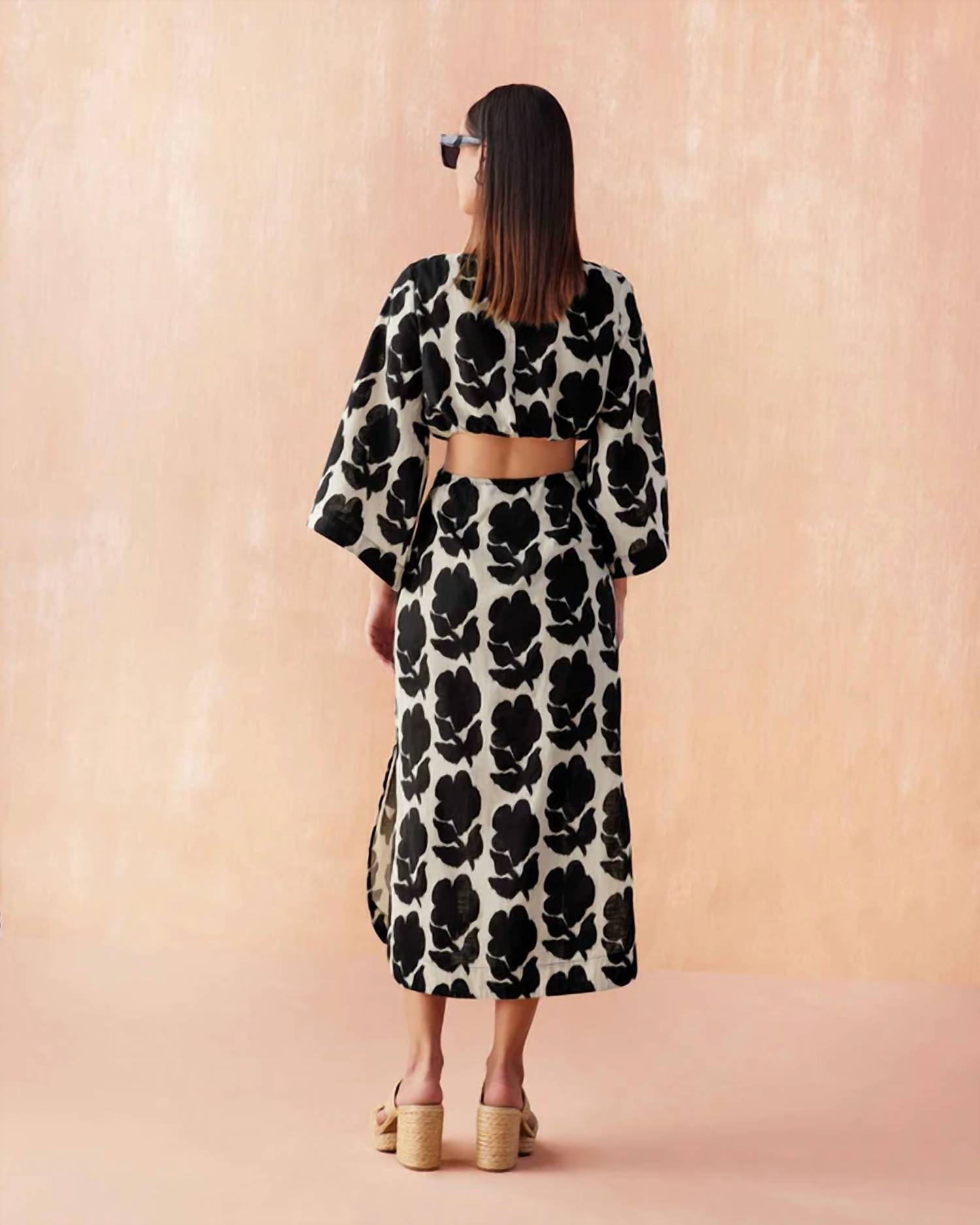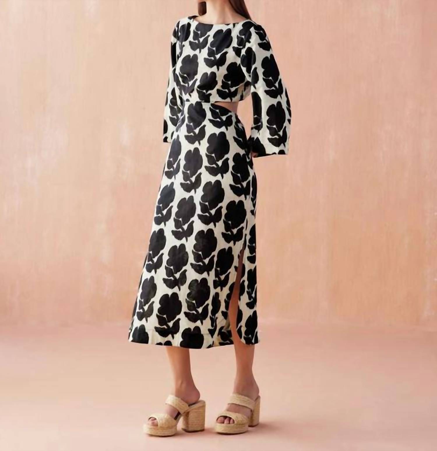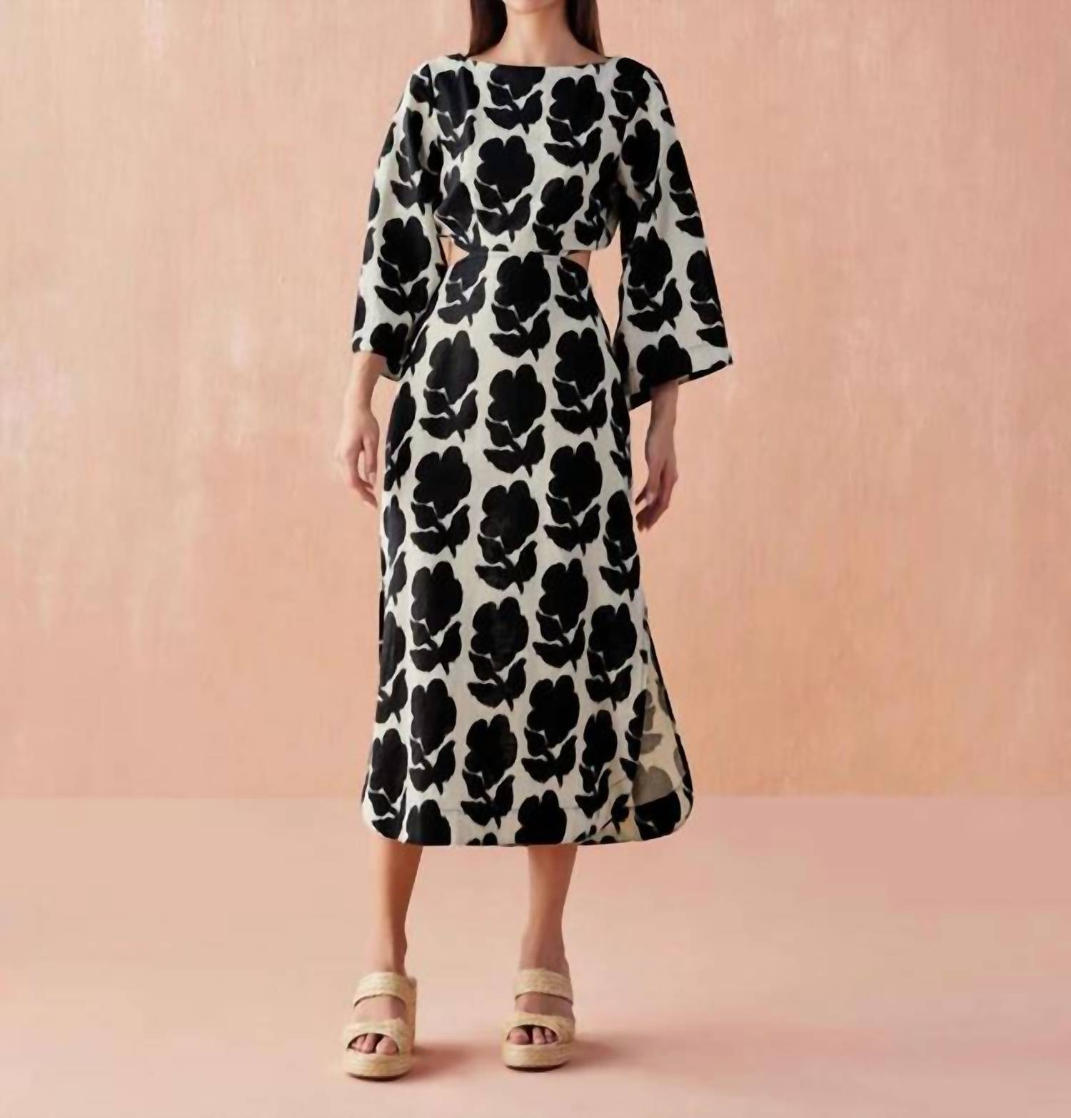 The perfect length dress does exist. Captivating piece in the Emma Mussel floral pattern crafted to turn heads. Features three-quarter bell sleeves, a boat neckline with a keyhole button, and a sheath silhouette for a chic dinner party look. Composed of 85% Cotton, 15% Linen. Length: 50.5" from size S. Zip closure with an elastic waist at the back and a unique open cutout detail. Machine wash, line dry. Elevate your fall wardrobe with this timeless piece inspired by 90s fashion.