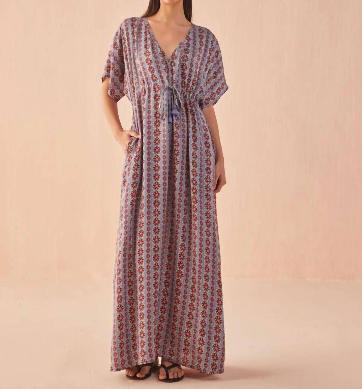 Experience the effortless elegance in an eye-catching Omari Hibiscus floral print. Featuring short sleeves. Crafted from 100% Modal. Offers a luxurious feel and a flattering adjustable empire waist with a drawstring tie. With drop shoulders, an adjustable V-neck, and a pull-on closure. Complements any summer occasion with boho chic flair. Practical side slits and pockets add convenience. Comfortably fits US sizes 0-12. Care is simple with machine wash and line dry instructions, making it a perfect beach day essential. Length: 56", Slit Height: 24 3/4".