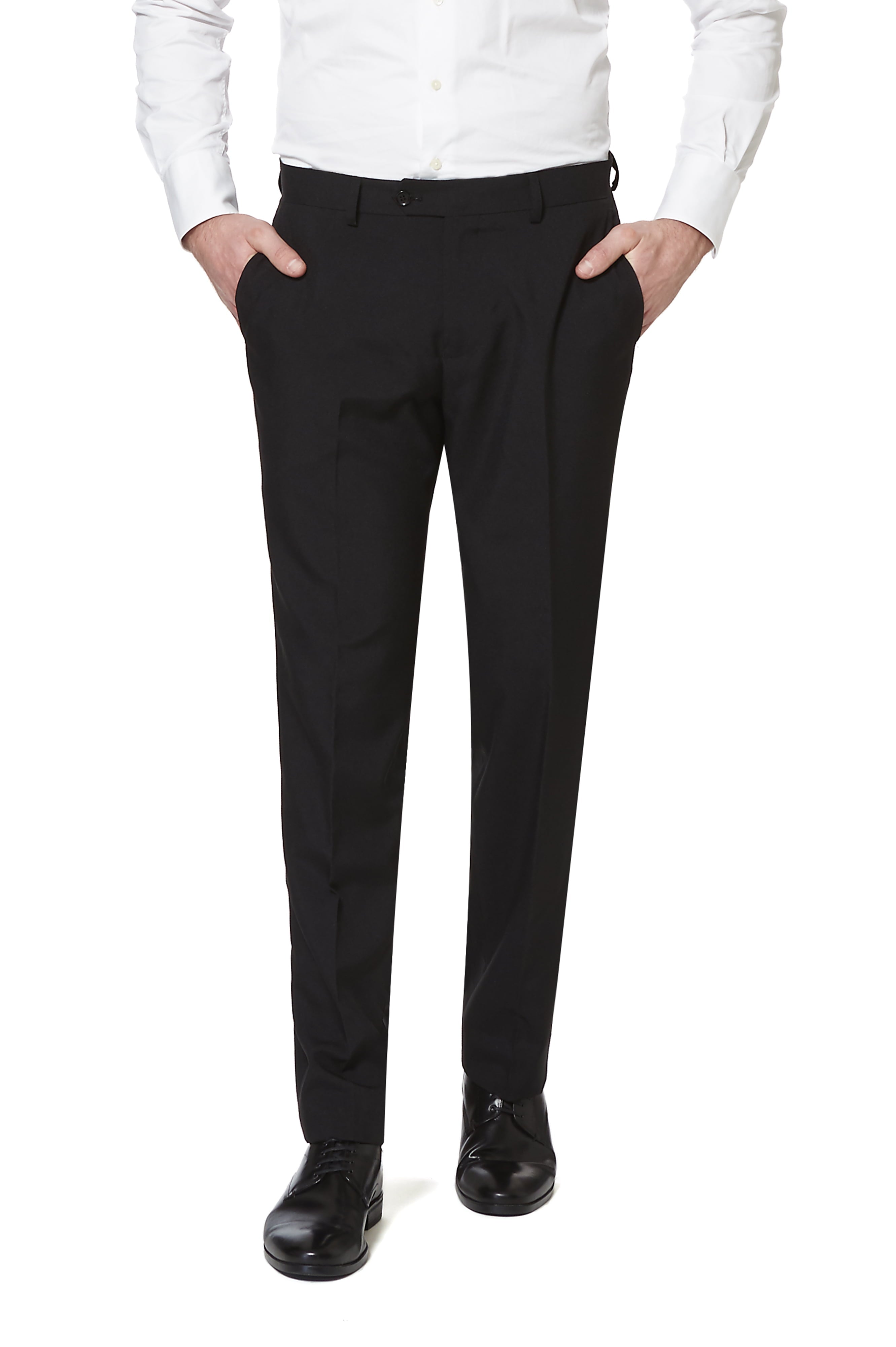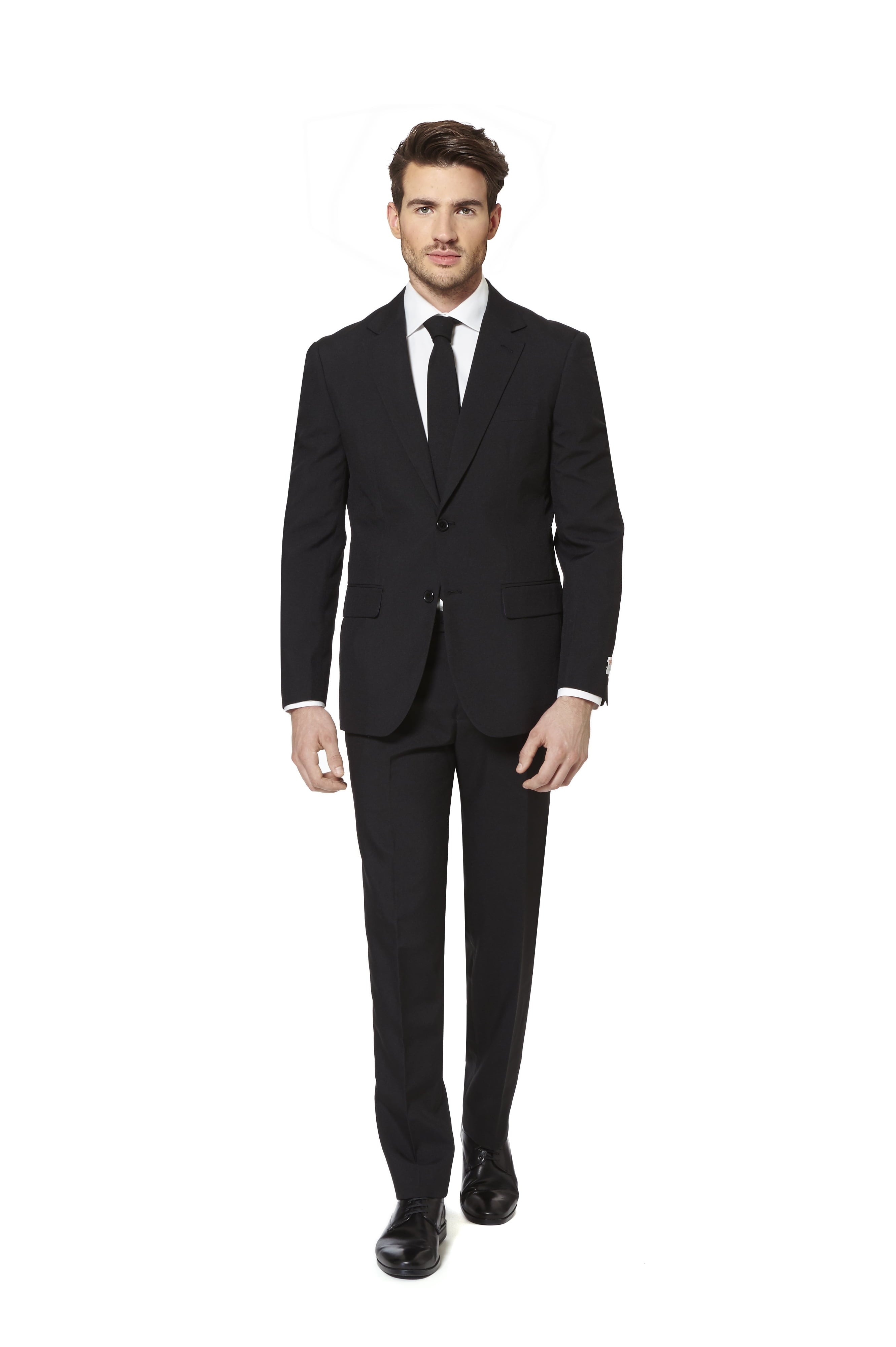 The OppoSuits 'Black Knight' Trim Fit Two-Piece Suit is a dapper apparel set that comes tagged with a size measure of 42| Synonymous with elegance and sophistication| this two-piece suit embraces a classic black hue that earned it its name| 'Black Knight|' The suit embodies a sharp| well-tailored look that accentuates an ideal blend of comfort and style| The trim fit design lends a modern silhouette that gracefully outlines the body contours