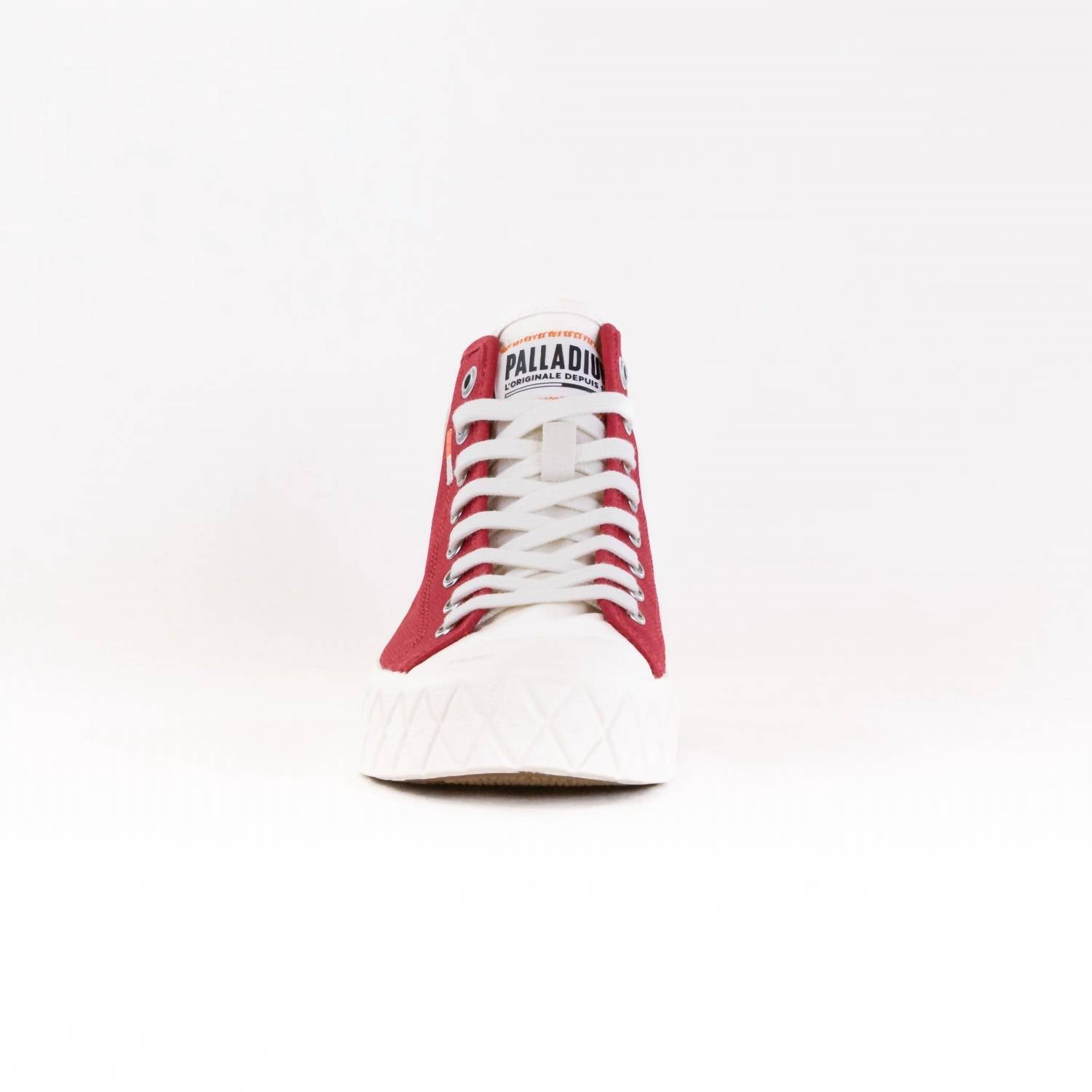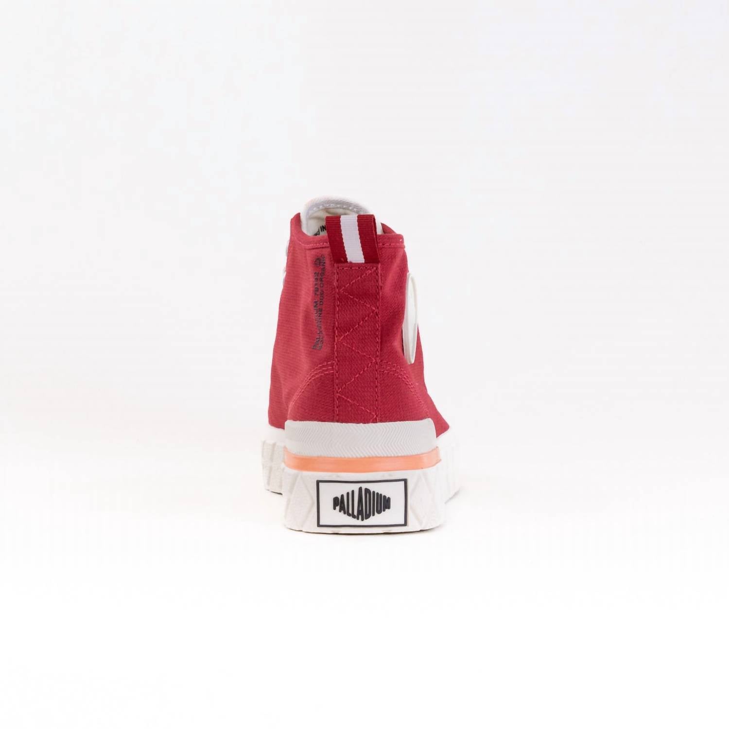 Introducing the Women's Palla Ace Chukka Organic by Palladium, an iconic sneaker-boot hybrid in vibrant Chili Pepper. Crafted with a mid-cut upper from 100% organic cotton, this piece features a resilient rubber outsole and a protective rubber toecap, ideal for streetwear elegance. With a textile lining and a cotton insock, this flat heel shoe is tailored for comfort during sunnier spring days. Closure: Lace-up. This model comes with distinctive Palladium branding elements and is constructed using vulcanized techniques.