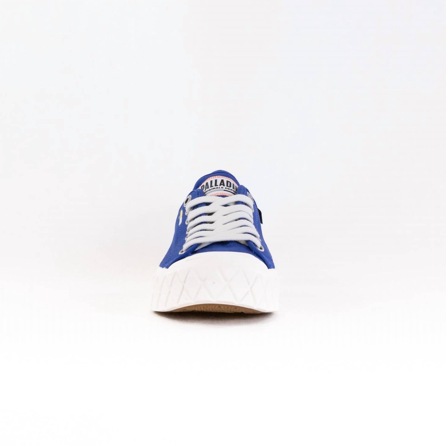 Step out in style with the Women's Palla Ace Canvas Organic sneakers by Palladium, designed in a vibrant Retro Blue. These low-cut sneakers showcase an upper composition of 100% organic cotton, lined with cotton for added comfort, and a 100% rubber outsole featuring a signature diamond-shaped design. Closure: Lace-up, offering a snug fit, complemented by branding elements like a side woven label and embroidered logos. Enjoy the vegan-friendly design without any heel, making these shoes a perfect choice for embracing a blend of tradition and modern values.