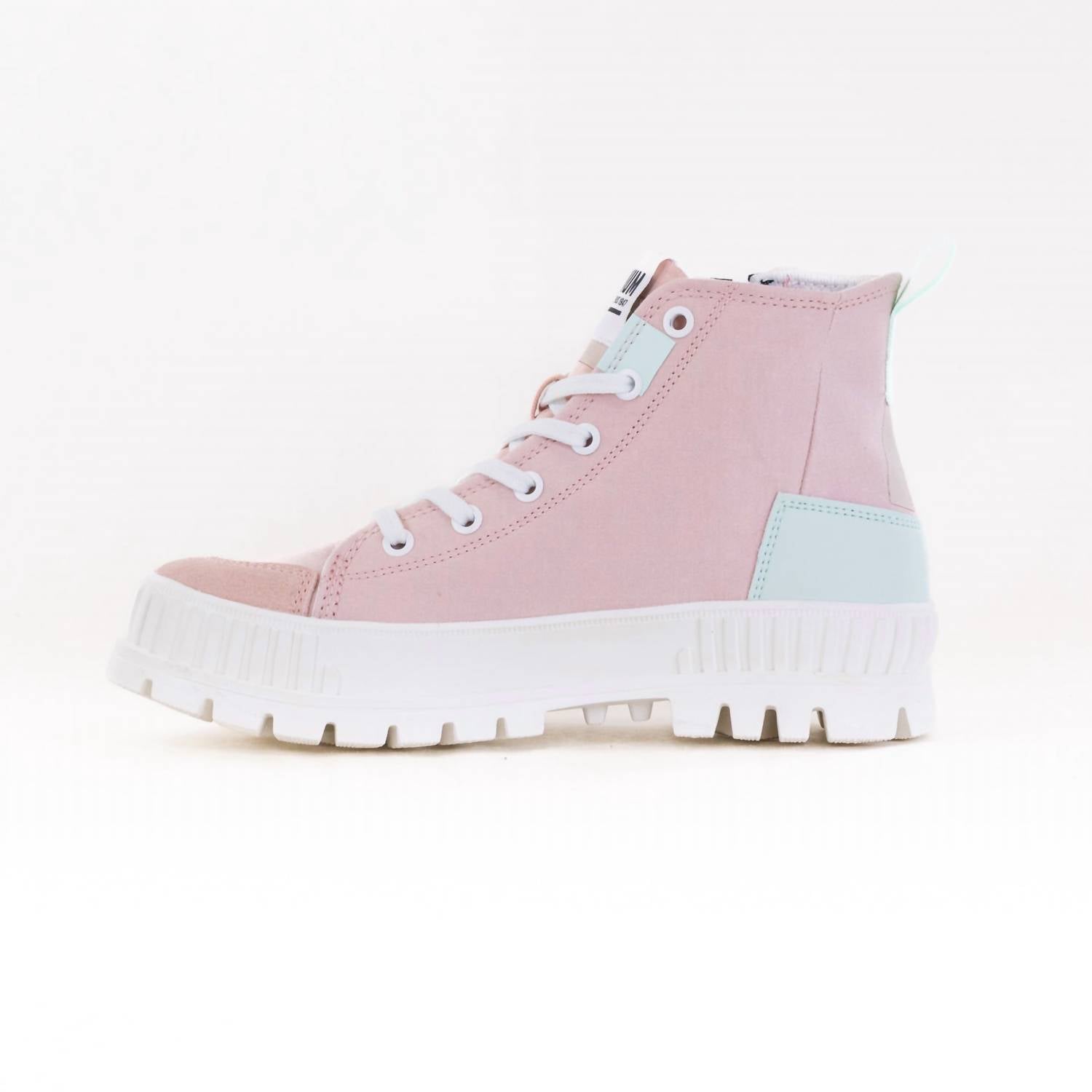 Meet the Women's Pallashock Backzip 2 by Palladium, a chic nature pink high-top sneaker perfect for spring. Its 91.22% cotton and 8.78% suede construction ensures both durability and a sophisticated look. Featuring a convenient lace and zipper closure, this shoe offers exceptional ease of wear. The 20mm flat heel height provides comfort, while playful prints and branding elements add a modern edge.