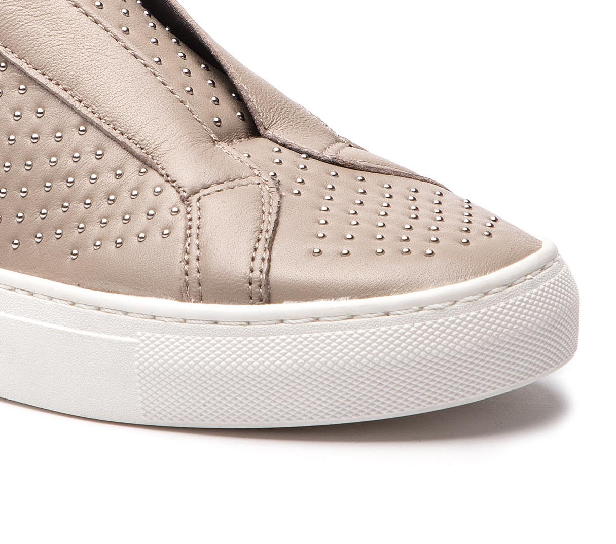 Studded upper; metallic block-letter logo at tongue| Manmade upper; manmade sole| Imported