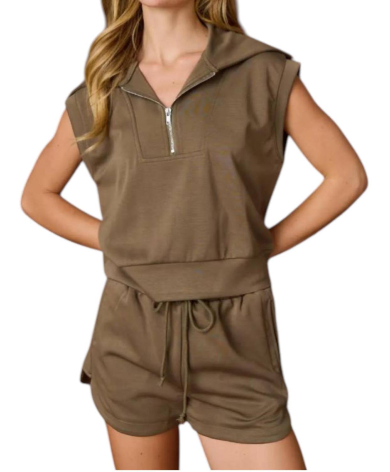 Elevate your athleisure wardrobe with the Olive Half Zip Cropped Sweatshirt and Shorts Set by PAPERMOON. This set features cap sleeves and a v-neckline, perfect for spring fitness or workout sessions. The solid olive color adds a trendy touch to your loungewear, with a convenient half zip closure on the cropped sweatshirt. Care for this comfortable and stylish set by hand washing and laying flat to dry.