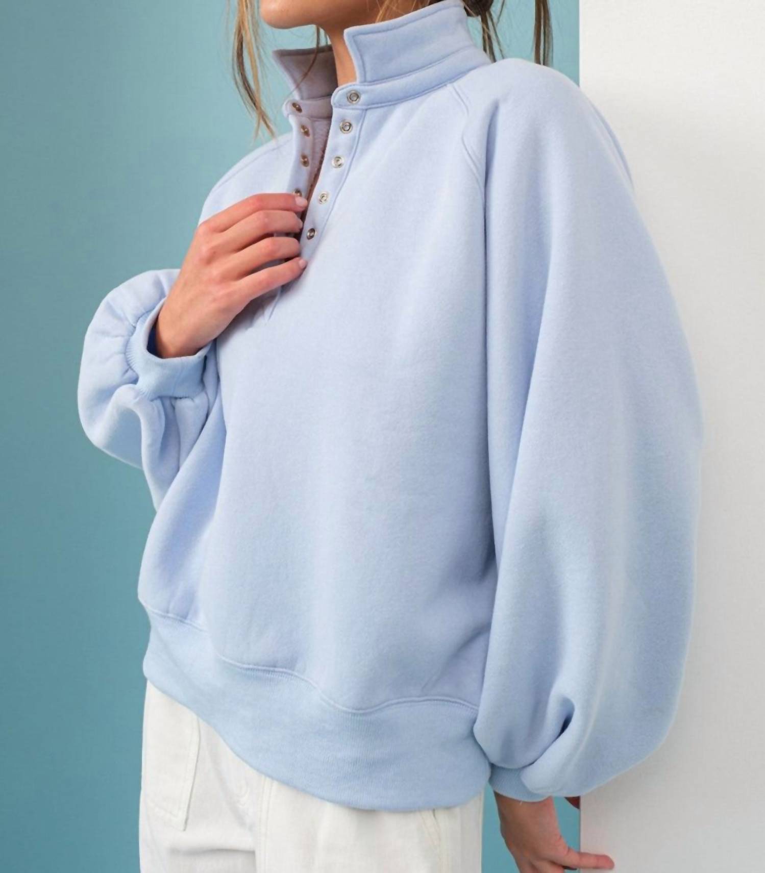 Whether you're running around town or lounging at home, this sweatshirt works for both. Elevate your style with the Piper Snap Button Collared Pullover Sweatshirt. Designed with long sleeves and a unique snap closure at the collar, this women's pullover is a standout addition to any wardrobe. Enjoy the versatile solid pattern that makes it suitable for various occasions, providing a cozy yet fashionable touch throughout the season. Whether dressing up or down, this stylish pullover ensures you remain on trend effortlessly.