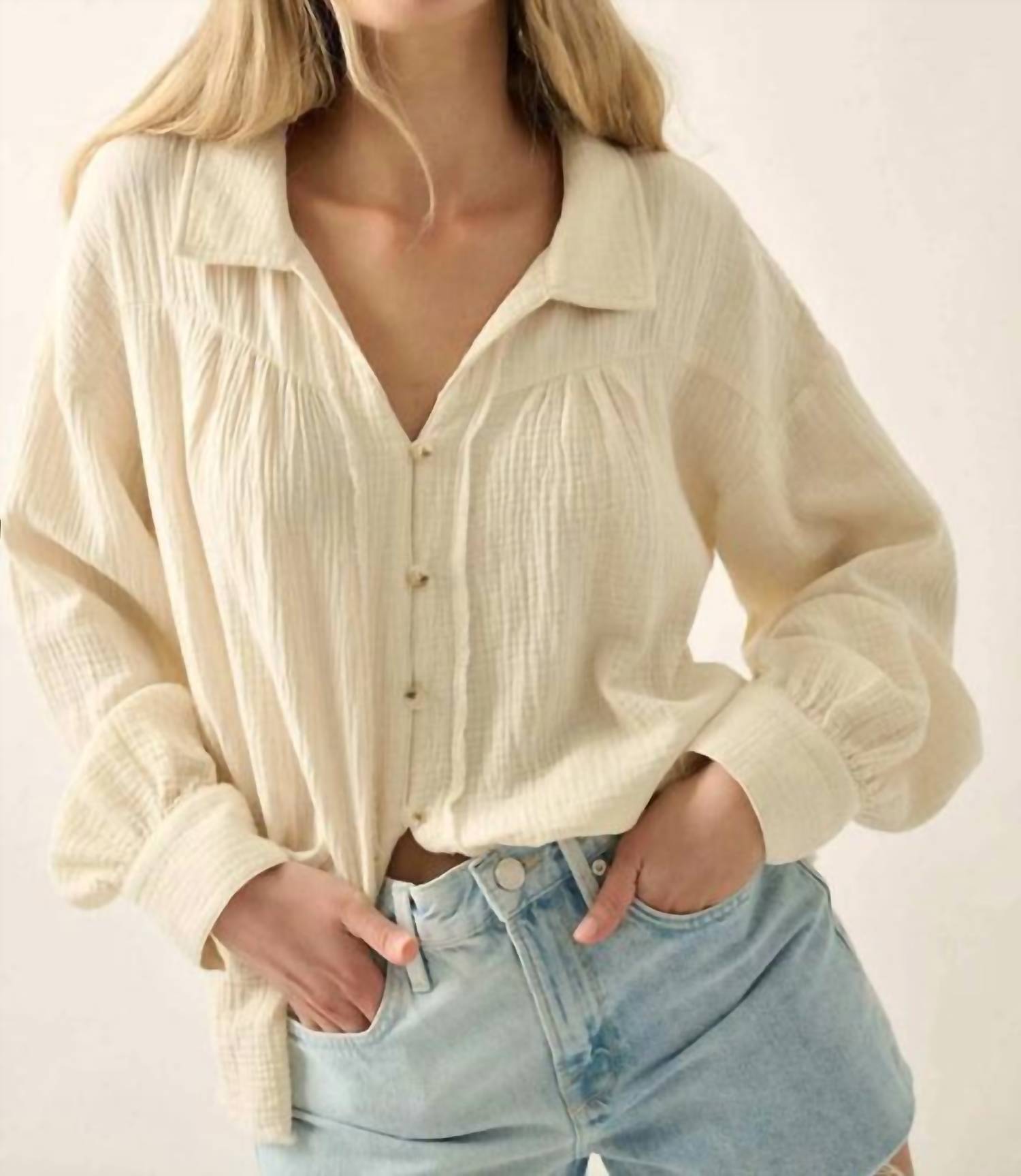 Perfectly tailored and soft to the touch. This shirt features long sleeves with buttoned cuffs, a collared neckline, and a distinctive button loop front closure. Crafted from solid cotton gauze, its design showcases a drop shoulder, exposed seams, and a raw-edge hem, with additional details such as a front yoke, pleated back, and curved shirttail hem for a loose fit. Ideal for those seeking both comfort and a chic aesthetic. 100% Cotton.