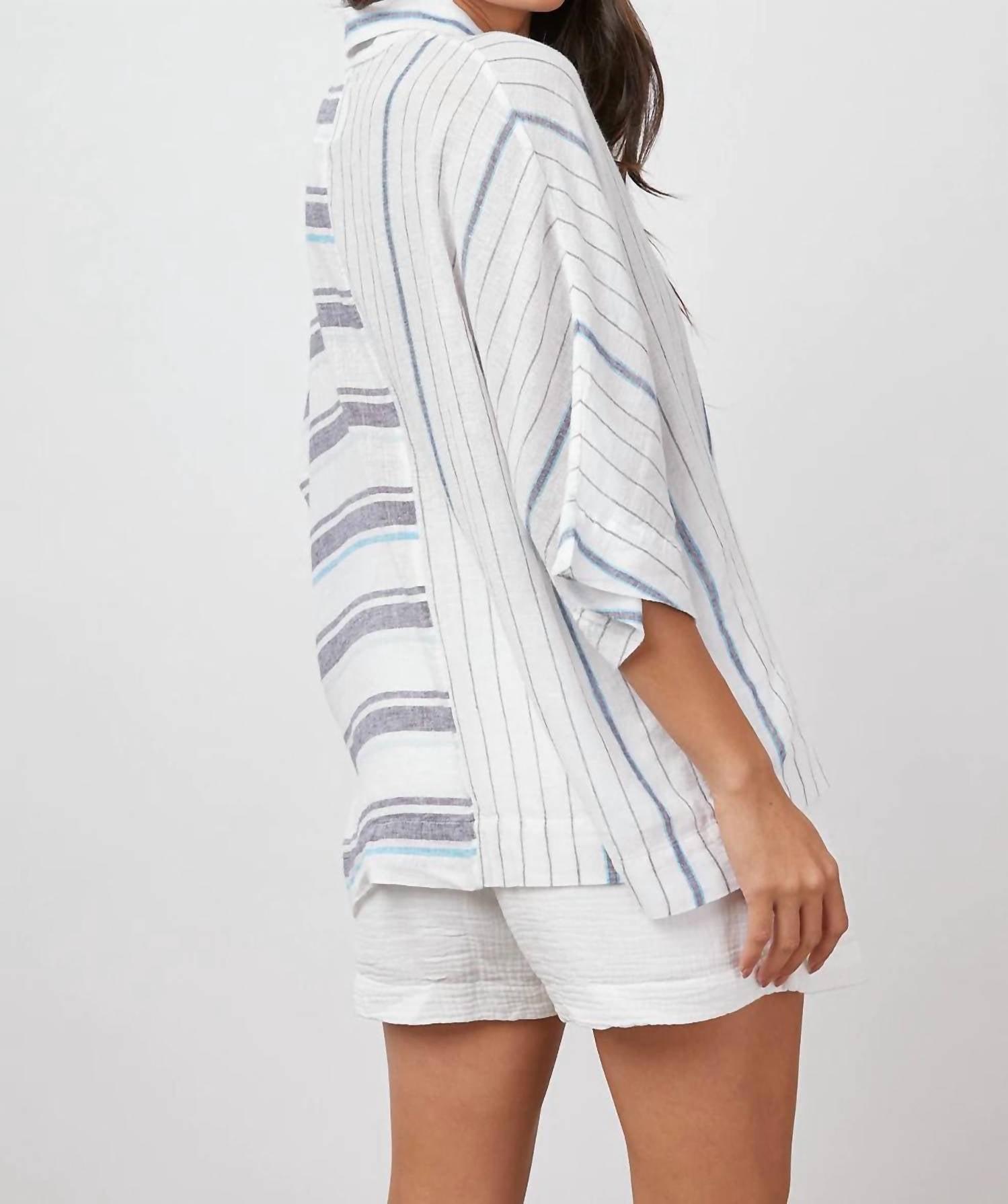 This button down shirt is comfortable yet polished.Oversized. Button down features mixed vertical and horizontal stripes, natural shell buttons and a single patch pocket at chest. 55% Linen | 45% Rayon. Recommend ordering true to size. Hand Wash Cold. Cool Iron If Necessary. Imported.